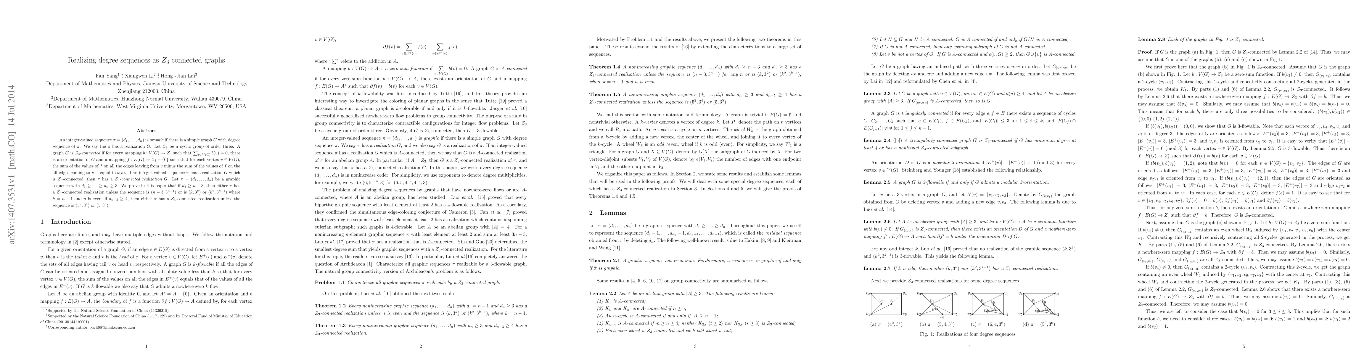 An integer-valued sequence $\pi=(d_1, \ldots, d_n)$ is {\em graphic} if there is a simple graph $G$ with degree sequence of $\pi$. We say the $\pi$ has a realization $G$. Let $Z_3$ be a cyclic group of order three. A graph $G$ is {\em $Z_3$-connected} if for every mapping $b:V(G)\to Z_3$ such that $\sum_{v\in V(G)}b(v)=0$, there is an orientation of $G$ and a mapping $f: E(G)\to Z_3-\{0\}$ such that for each vertex $v\in V(G)$, the sum of the values of $f$ on all the edges leaving from $v$ minus the sum of the values of $f$ on the all edges coming to $v$ is equal to $b(v)$. If an integer-valued sequence $\pi$ has a realization $G$ which is $Z_3$-connected, then $\pi$ has a {\em $Z_3$-connected realization} $G$. Let $\pi=(d_1, \ldots, d_n)$ be a graphic sequence with $d_1\ge \ldots \ge d_n\ge 3$. We prove in this paper that if $d_1\ge n-3$, then either $\pi$ has a $Z_3$-connected realization unless the sequence is $(n-3, 3^{n-1})$ or is $(k, 3^k)$ or $(k^2, 3^{k-1})$ where $k=n-1$ and $n$ is even; if $d_{n-5}\ge 4$, then either $\pi$ has a $Z_3$-connected realization unless the sequence is $(5^2, 3^4)$ or $(5, 3^5)$.