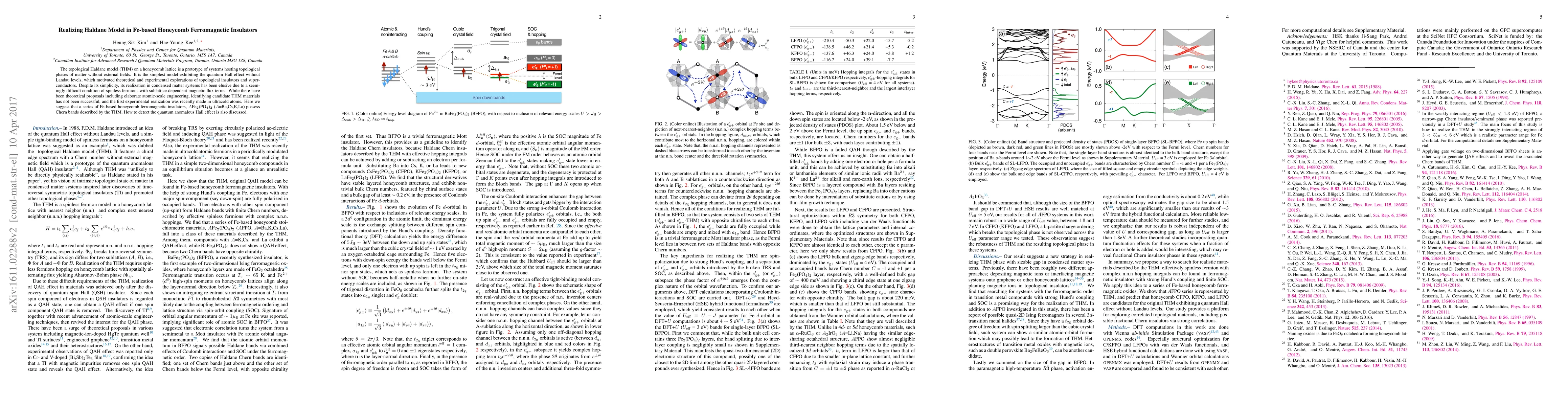 The topological Haldane model (THM) on a honeycomb lattice is a prototype of systems hosting topological phases of matter without external fields. It is the simplest model exhibiting the quantum Hall effect without Landau levels, which motivated theoretical and experimental explorations of topological insulators and superconductors. Despite its simplicity, its realization in condensed matter systems has been elusive due to a seemingly difficult condition of spinless fermions with sublattice-dependent magnetic flux terms. While there have been theoretical proposals including elaborate atomic-scale engineering, identifying candidate THM materials has not been successful, and the first experimental realization was recently made in ultracold atoms. Here we suggest that a series of Fe-based honeycomb ferromagnetic insulators, AFe2(PO4)2 (A=Ba,Cs,K,La) possess Chern bands described by the THM. How to detect the quantum anomalous Hall effect is also discussed.