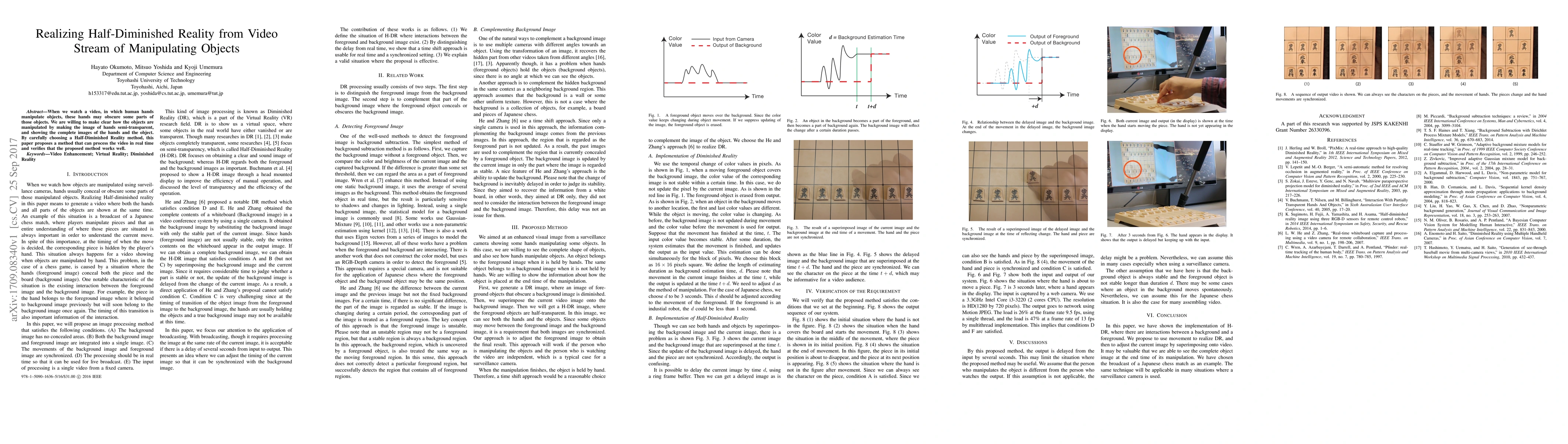 When we watch a video, in which human hands manipulate objects, these hands may obscure some parts of those objects. We are willing to make clear how the objects are manipulated by making the image of hands semi-transparent, and showing the complete images of the hands and the object. By carefully choosing a Half-Diminished Reality method, this paper proposes a method that can process the video in real time and verifies that the proposed method works well.