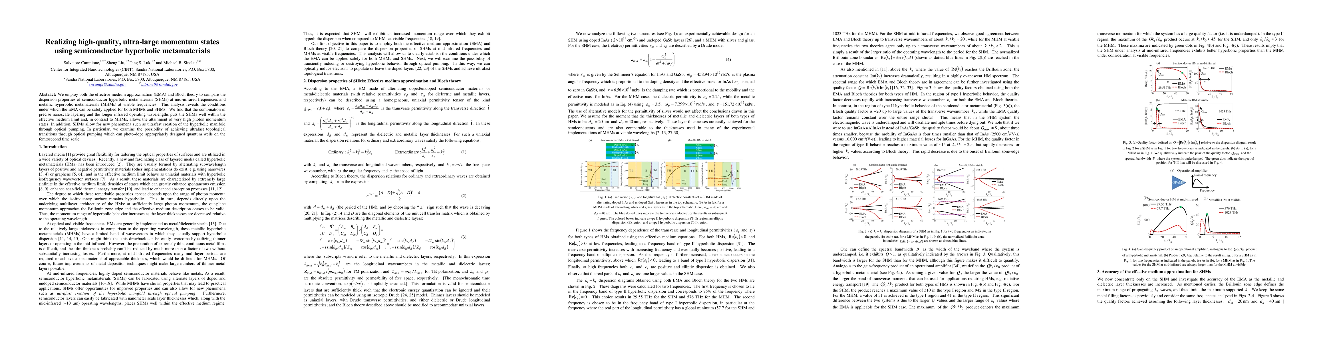 We employ both the effective medium approximation (EMA) and Bloch theory to compare the dispersion properties of semiconductor hyperbolic metamaterials (SHMs) at mid-infrared frequencies and metallic hyperbolic metamaterials (MHMs) at visible frequencies. This analysis reveals the conditions under which the EMA can be safely applied for both MHMs and SHMs. We find that the combination of precise nanoscale layering and the longer infrared operating wavelengths puts the SHMs well within the effective medium limit and, in contrast to MHMs, allows the attainment of very high photon momentum states. In addition, SHMs allow for new phenomena such as ultrafast creation of the hyperbolic manifold through optical pumping. In particular, we examine the possibility of achieving ultrafast topological transitions through optical pumping which can photo-dope appropriately designed quantum wells on the femtosecond time scale.