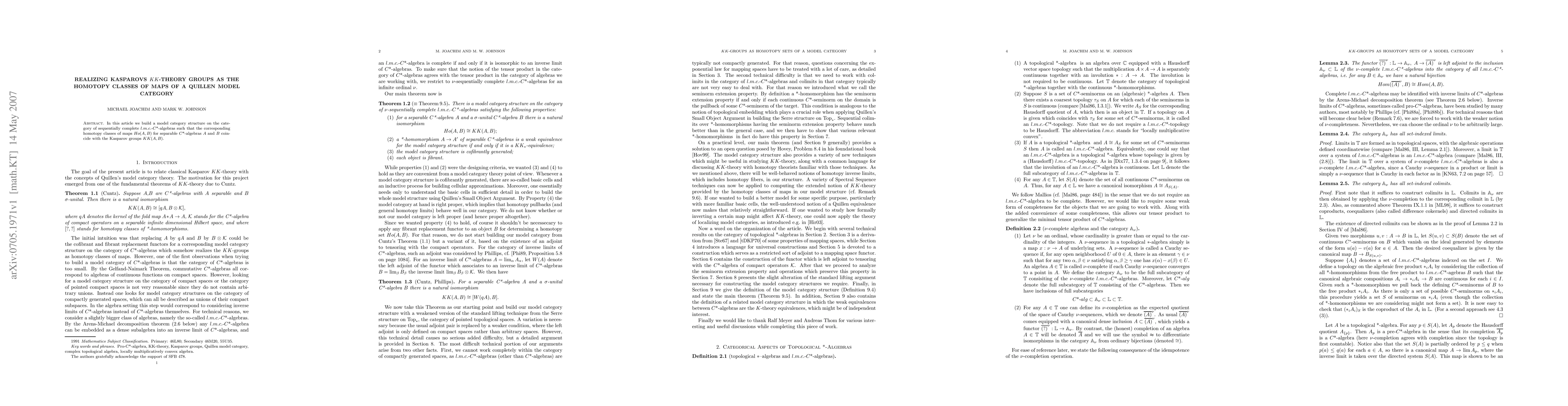 This paper constructs a Quillen model category for sequentially complete l.m.c.-C*-algebras, showing that its homotopy classes of maps match the Kasparov KK-theory groups, thus addressing an open question by Mark Hovey on describing KK-theory via Quillen model categories.