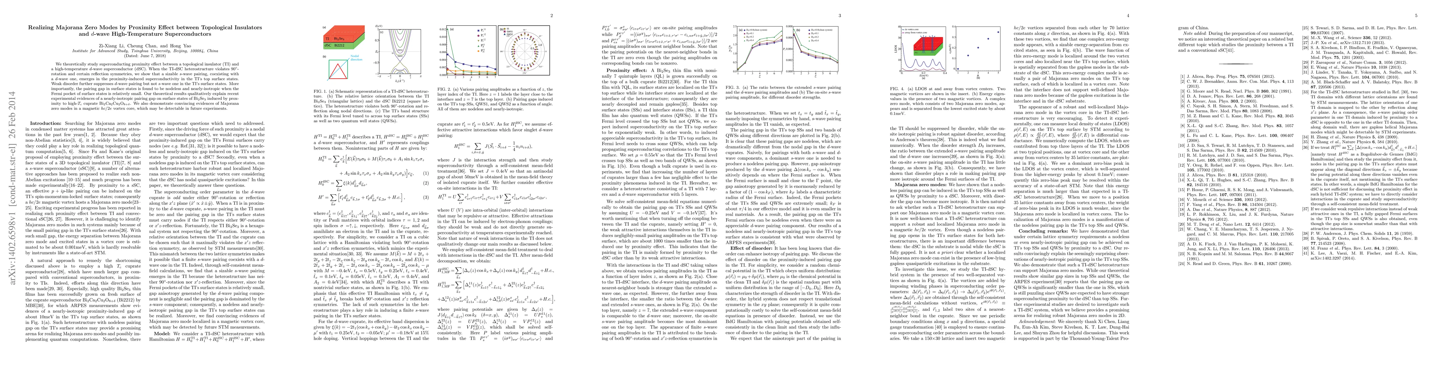 This paper theoretically investigates the superconducting proximity effect between a topological insulator and a high-temperature d-wave superconductor, revealing the emergence of a sizable s-wave pairing in the TI's surface states. It also demonstrates the presence of Majorana zero modes in vortex cores, potentially detectable in future experiments.