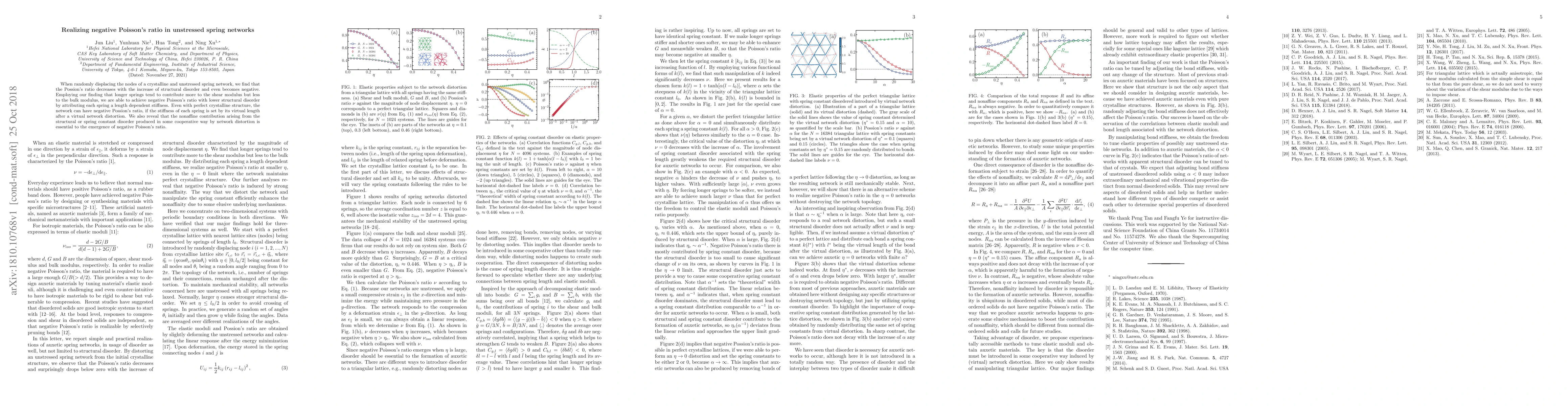 This research demonstrates how to engineer negative Poisson's ratio in unstressed spring networks by adjusting spring stiffness based on length, reducing structural disorder. It highlights the importance of nonaffine contributions from network distortion for achieving this unusual property.