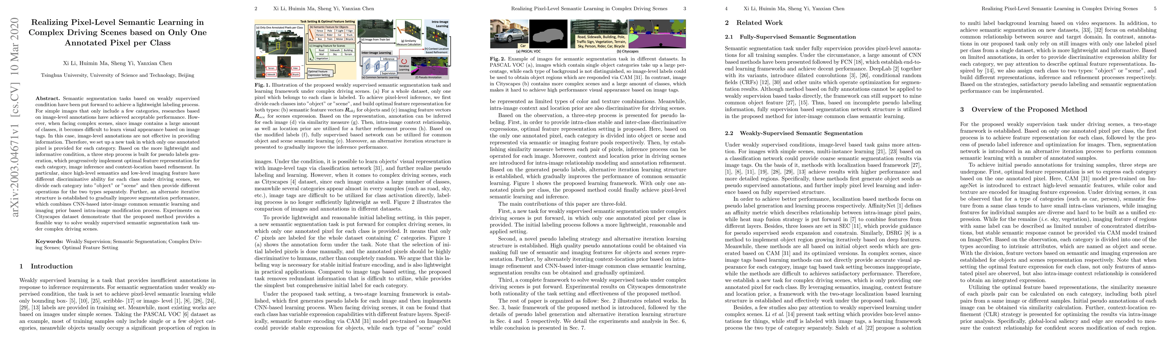 This paper proposes a novel weakly supervised semantic segmentation method that uses only one annotated pixel per class to achieve pixel-level semantic learning in complex driving scenes. It employs a three-step process for pseudo label generation and iterative refinement, distinguishing between "object" and "scene" categories to optimize feature representation, and demonstrates improved performance on the Cityscapes dataset.