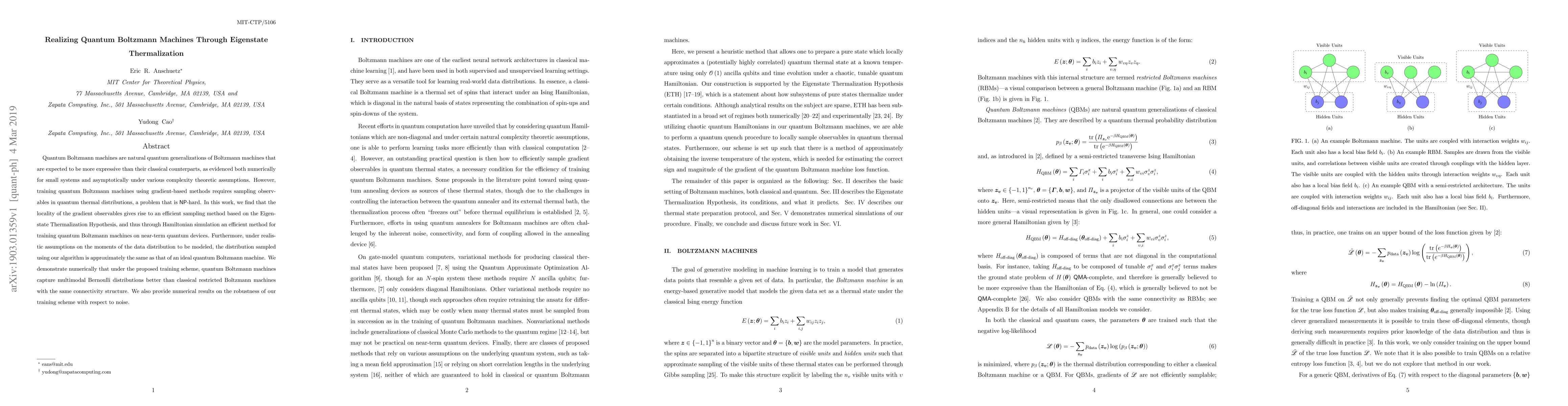 This paper proposes an efficient training method for quantum Boltzmann machines leveraging the Eigenstate Thermalization Hypothesis to sample quantum thermal distributions. The authors demonstrate that their method outperforms classical restricted Boltzmann machines in capturing multimodal Bernoulli distributions and shows robustness to noise.