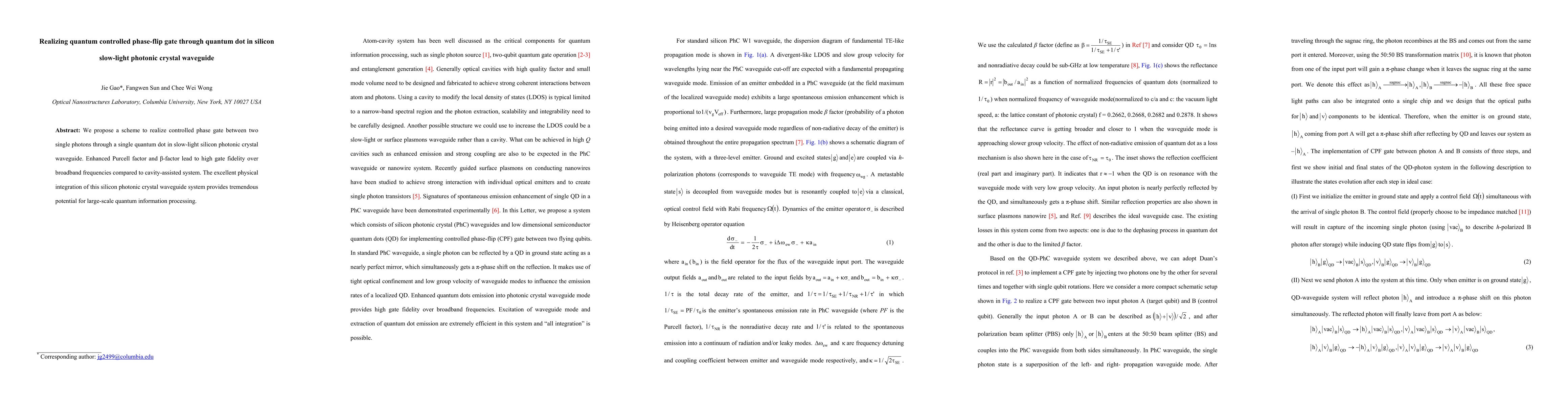 This research proposes a method to achieve a controlled phase-flip gate using a quantum dot in a silicon photonic crystal waveguide, achieving high gate fidelity due to enhanced Purcell and beta factors, with potential for large-scale quantum information processing. The integration of this system in silicon offers significant advantages over cavity-assisted methods.