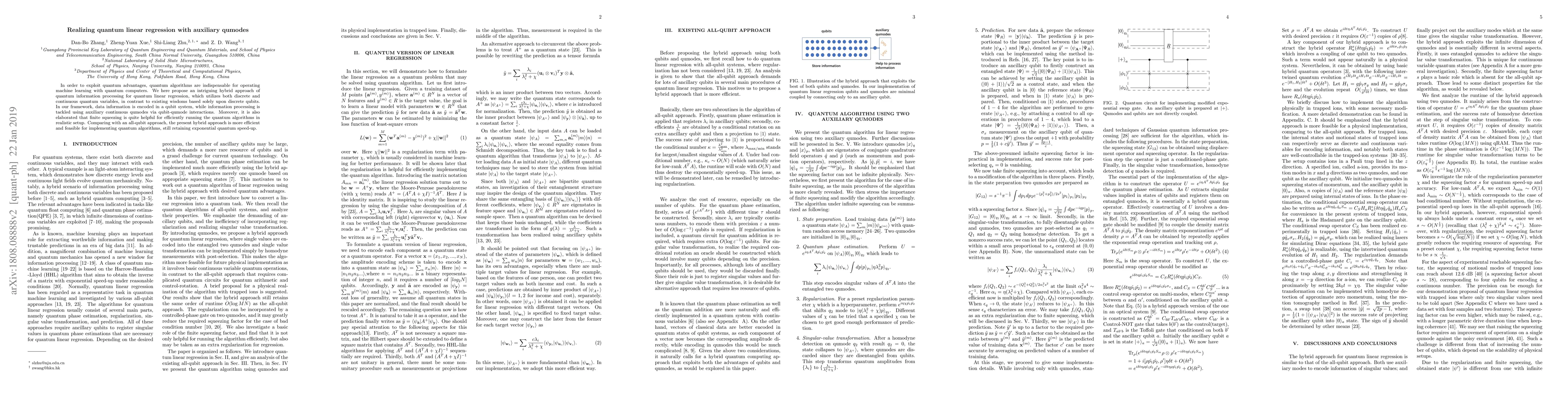 In order to exploit quantum advantages, quantum algorithms are indispensable for operating machine learning with quantum computers. We here propose an intriguing hybrid approach of quantum information processing for quantum linear regression, which utilizes both discrete and continuous quantum variables, in contrast to existing wisdoms based solely upon discrete qubits. In our framework, data information is encoded in a qubit system, while information processing is tackled using auxiliary continuous qumodes via qubit-qumode interactions. Moreover, it is also elaborated that finite squeezing is quite helpful for efficiently running the quantum algorithms in realistic setup. Comparing with an all-qubit approach, the present hybrid approach is more efficient and feasible for implementing quantum algorithms, still retaining exponential quantum speed-up.