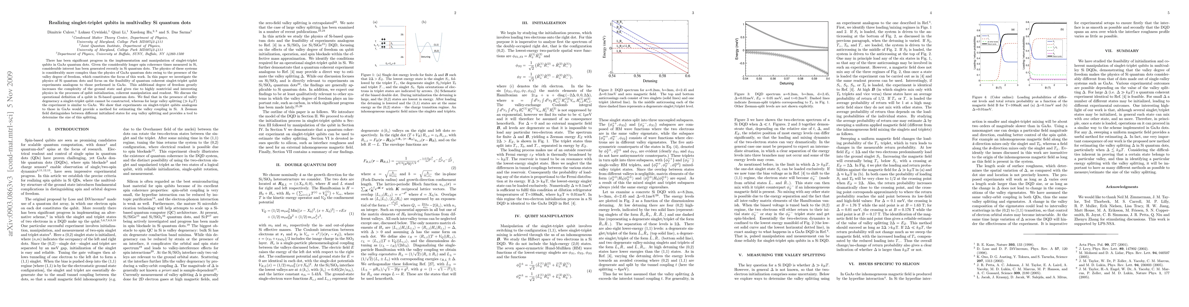 This paper explores the feasibility of implementing singlet-triplet qubits in silicon quantum dots, noting the added complexity due to the valley degree of freedom. It concludes that while a qubit cannot be constructed in the presence of valley degeneracy, large valley splitting allows for experiments similar to those in GaAs, providing a method to estimate valley coupling and determine valley splitting sizes.