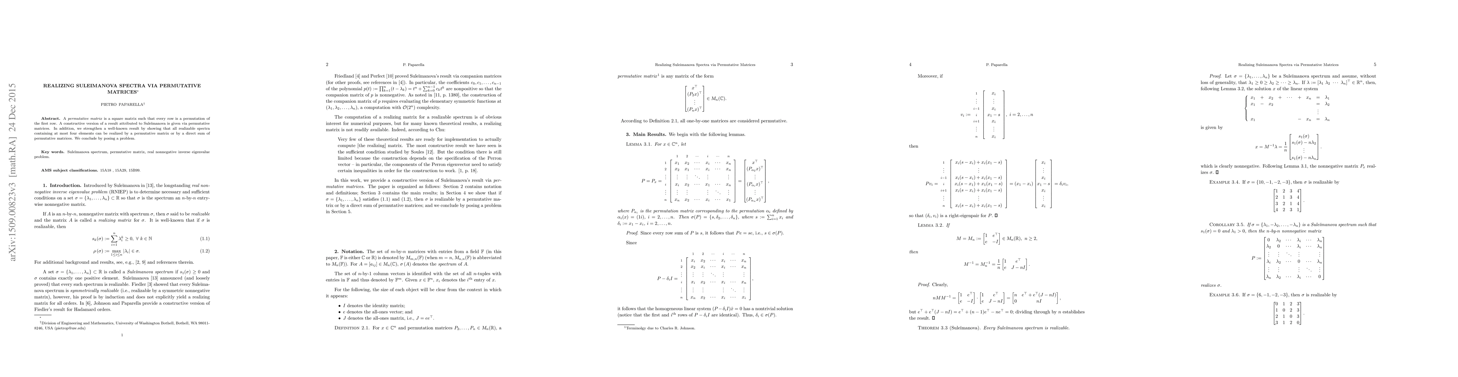 A permutative matrix is a square matrix such that every row is a permutation of the first row. A constructive version of a result attributed to Suleimanova is given via permutative matrices. In addition, we strengthen a well-known result by showing that all realizable spectra containing at most four elements can be realized by a permutative matrix or by a direct sum of permutative matrices. We conclude by posing a problem.