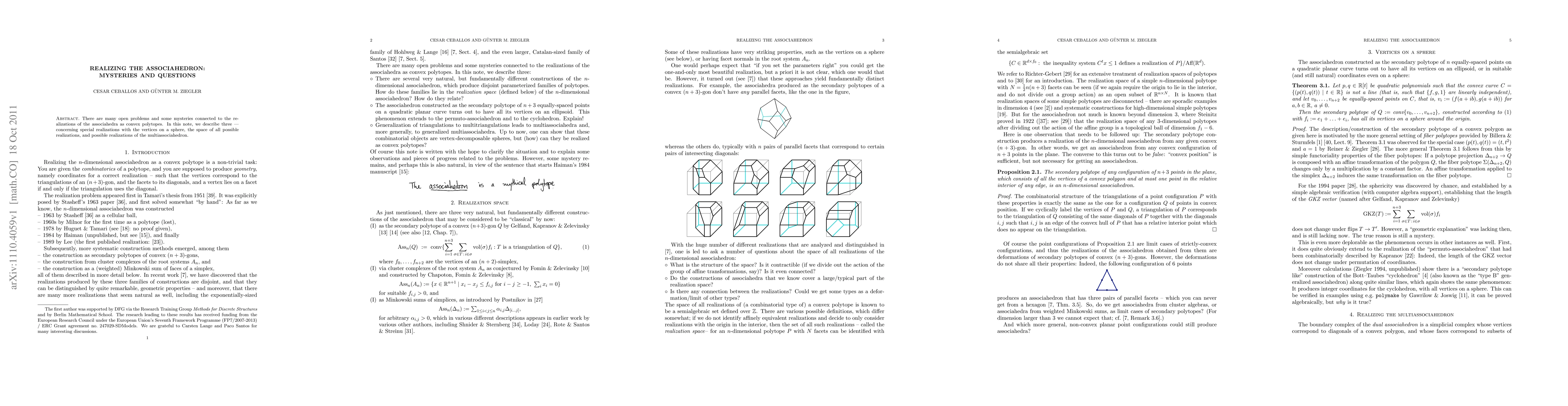There are many open problems and some mysteries connected to the realizations of the associahedra as convex polytopes. In this note, we describe three -- concerning special realizations with the vertices on a sphere, the space of all possible realizations, and possible realizations of the multiassociahedron.