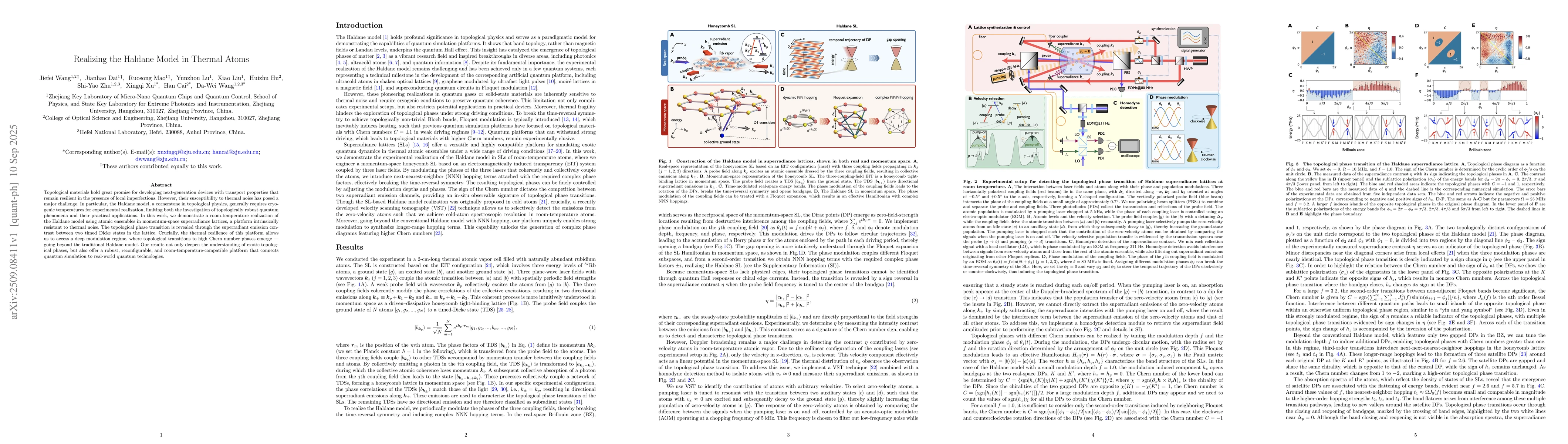 Topological materials hold great promise for developing next-generation devices with transport properties that remain resilient in the presence of local imperfections. However, their susceptibility to thermal noise has posed a major challenge. In particular, the Haldane model, a cornerstone in topological physics, generally requires cryogenic temperatures for experimental realization, limiting both the investigation of topologically robust quantum phenomena and their practical applications. In this work, we demonstrate a room-temperature realization of the Haldane model using atomic ensembles in momentum-space superradiance lattices, a platform intrinsically resistant to thermal noise. The topological phase transition is revealed through the superradiant emission contrast between two timed Dicke states in the lattice. Crucially, the thermal resilience of this platform allows us to access a deep modulation regime, where topological transitions to high Chern number phases emerge -- going beyond the traditional Haldane model. Our results not only deepen the understanding of exotic topological phases, but also offer a robust, reconfigurable, and room-temperature-compatible platform that connects quantum simulation to real-world quantum technologies.