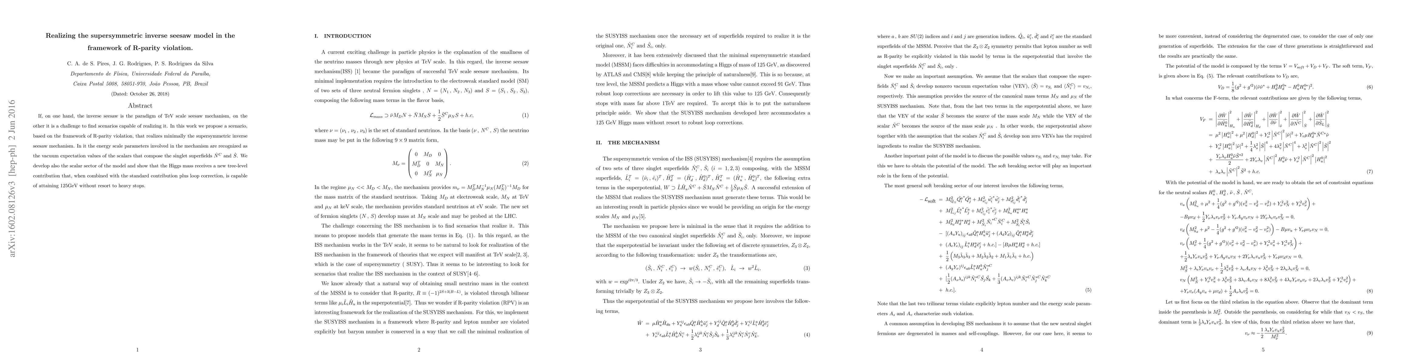 If, on one hand, the inverse seesaw is the paradigm of TeV scale seesaw mechanism, on the other it is a challenge to find scenarios capable of realizing it. In this work we propose a scenario, based on the framework of R-parity violation, that realizes minimally the supersymmetric inverse seesaw mechanism. In it the energy scale parameters involved in the mechanism are recognized as the vacuum expectation values of the scalars that compose the singlet superfields $\hat N^C$ and $\hat S$. We develop also the scalar sector of the model and show that the Higgs mass receives a new tree-level contribution that, when combined with the standard contribution plus loop correction, is capable of attaining $125$GeV without resort to heavy stops.