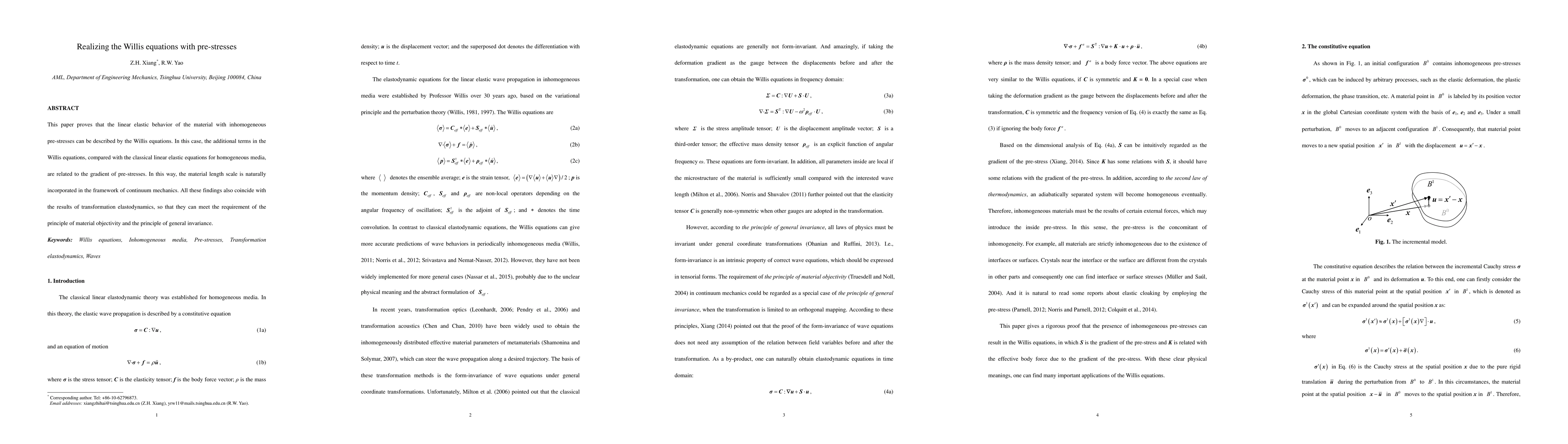 This paper proves that the linear elastic behavior of the material with inhomogeneous pre-stresses can be described by the Willis equations. In this case, the additional terms in the Willis equations, compared with the classical linear elastic equations for homogeneous media, are related to the gradient of pre-stresses. In this way, the material length scale is naturally incorporated in the framework of continuum mechanics. All these findings also coincide with the results of transformation elastodynamics, so that they can meet the requirement of the principle of material objectivity and the principle of general invariance.