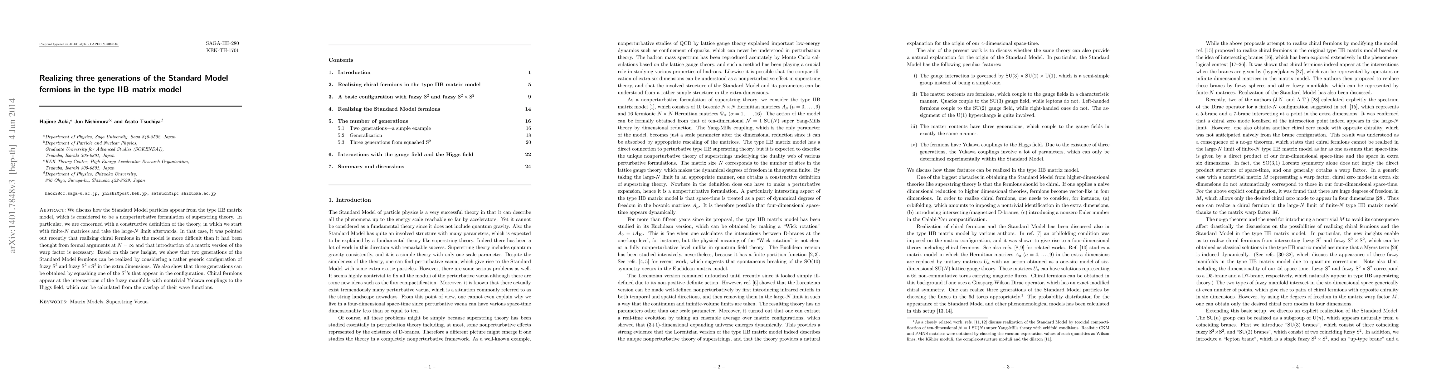 Researchers successfully realized two generations of Standard Model fermions in a type IIB matrix model and also found a way to realize three generations by squashing one fuzzy S^2.