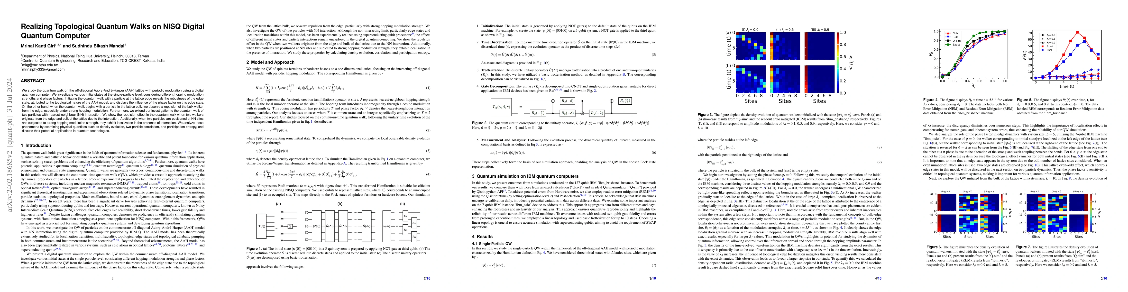 This research investigates topological quantum walks on the Aubry-Andre-Harper lattice using digital quantum hardware, focusing on edge and bulk state dynamics, interactions between particles, and their implications for quantum technology applications. It examines the effects of hopping modulation and initial states on the quantum walk's robustness and localization properties.