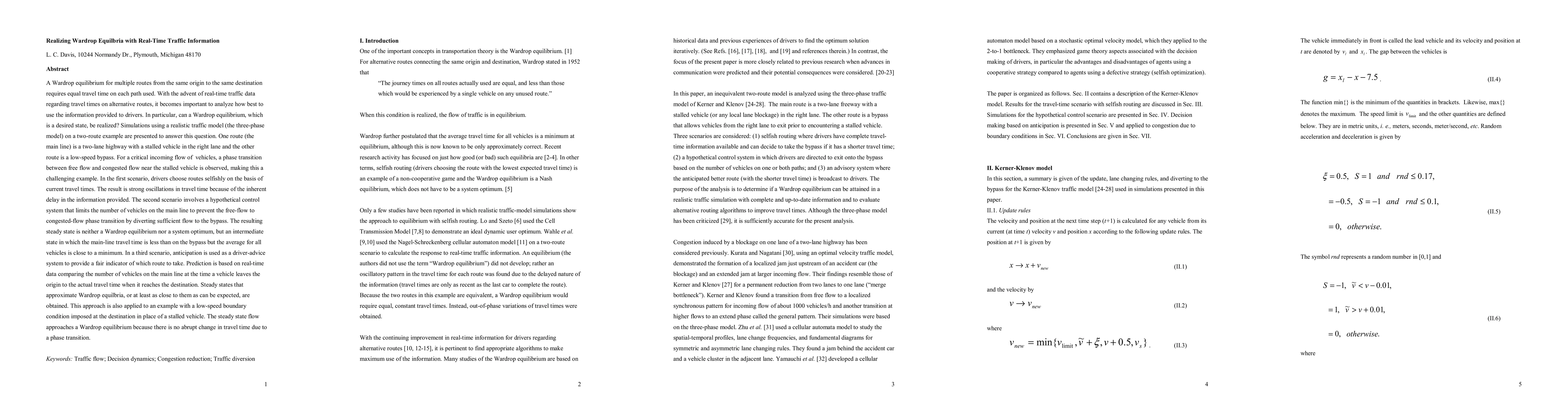 A Wardrop equilibrium for multiple routes requires equal travel time on each path used. With real-time traffic data regarding travel times, it is important to analyze how to use the information provided. In particular, can a Wardrop equilibrium be realized? Simulations using the three-phase model on a two-route example are presented to answer this question. One route (the main line) is a two-lane highway with a stalled vehicle in the right lane and the other route is a low-speed bypass. For a critical incoming flow, a phase transition between free flow and congested flow near the stalled vehicle is observed, making this a challenging example. In the first scenario, drivers choose routes selfishly on the basis of current travel times. The result is strong oscillations in travel time because of the inherent delay in the information provided. The second scenario involves a hypothetical control system that limits the number of vehicles on the main line to prevent the free-flow to congested-flow phase transition by diverting sufficient flow to the bypass. The resulting steady state is neither a Wardrop equilibrium nor a system optimum, but an intermediate state in which the main-line travel time is less than on the bypass but the average for all vehicles is close to a minimum. In a third scenario, anticipation is used as a driver-advice system to provide a fair indicator of which route to take. Prediction is based on real-time data comparing the number of vehicles on the main line at the time a vehicle leaves the origin to the actual travel time when it reaches the destination. Steady states that approximate Wardrop equilbria, or close to them, are obtained.