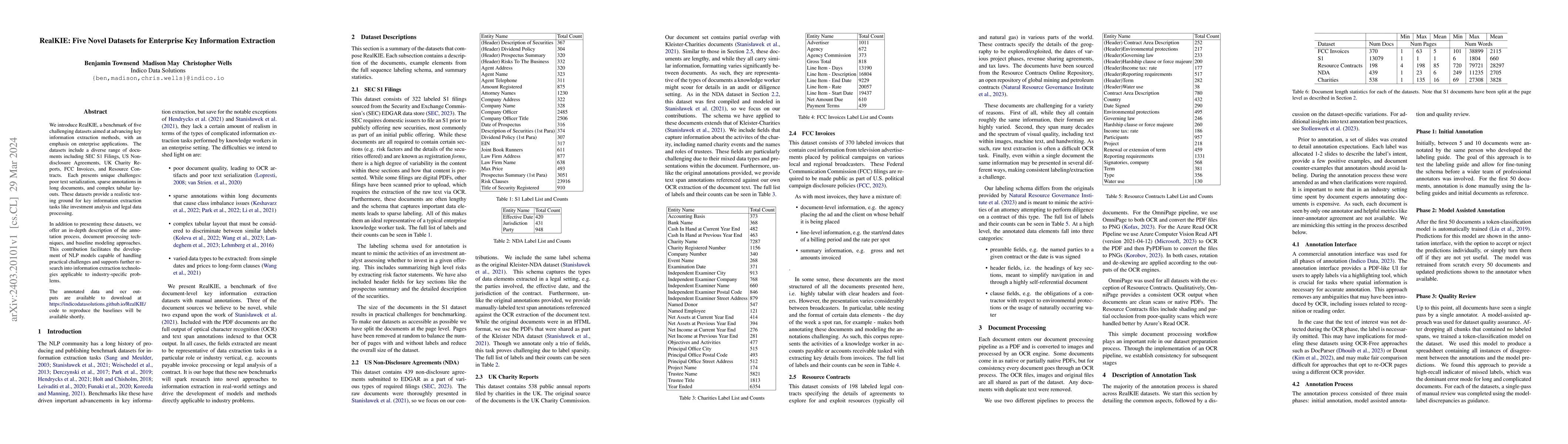 RealKIE introduces five diverse enterprise document datasets to advance key information extraction, featuring SEC filings, NDAs, charity reports, invoices, and contracts. These datasets aim to develop robust NLP models for practical applications, with resources available for research.