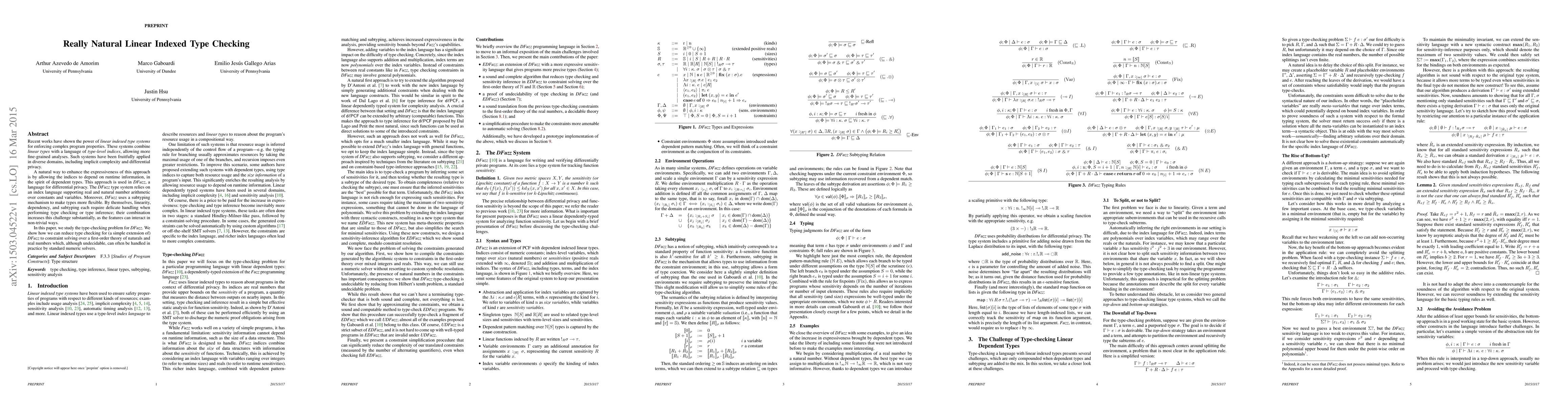 This paper explores the type-checking problem for DFuzz, a type system combining linear types, dependent types, and subtyping for enforcing complex program properties. It reduces type checking to solving constraints over a first-order theory of naturals and reals, which can often be practically handled by numeric solvers despite being undecidable.