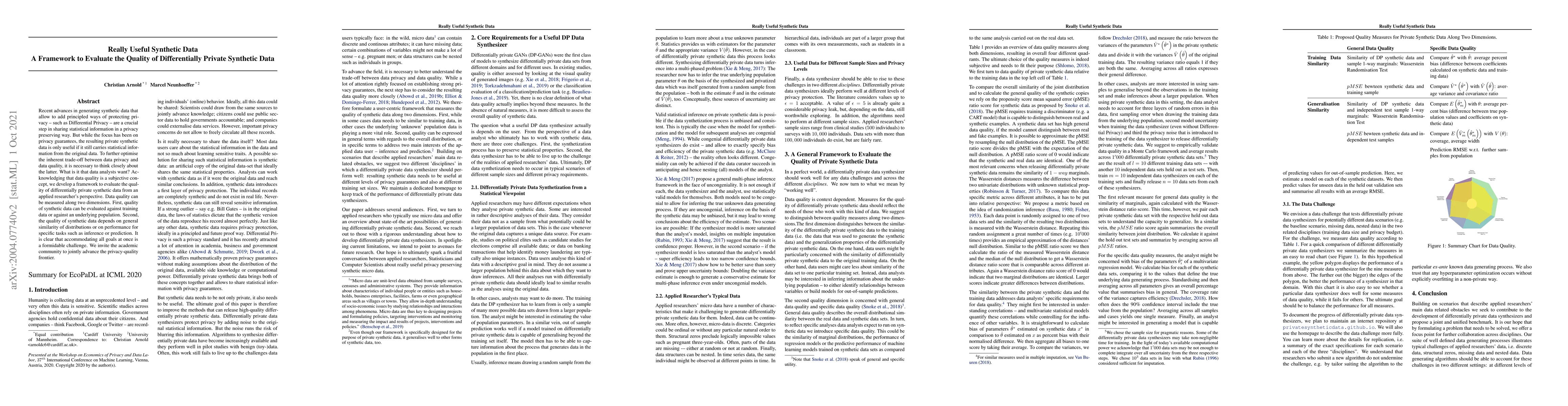This paper introduces a framework to evaluate the quality of differentially private synthetic data, focusing on the balance between privacy and statistical information. It proposes two dimensions for assessing data quality: comparison to training data or population, and relevance for specific tasks like inference or prediction.