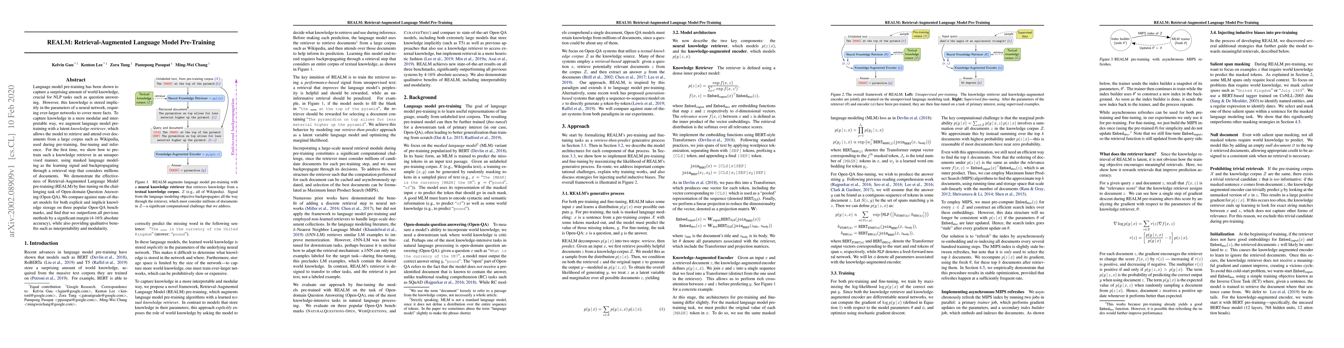 Language model pre-training has been shown to capture a surprising amount of world knowledge, crucial for NLP tasks such as question answering. However, this knowledge is stored implicitly in the parameters of a neural network, requiring ever-larger networks to cover more facts. To capture knowledge in a more modular and interpretable way, we augment language model pre-training with a latent knowledge retriever, which allows the model to retrieve and attend over documents from a large corpus such as Wikipedia, used during pre-training, fine-tuning and inference. For the first time, we show how to pre-train such a knowledge retriever in an unsupervised manner, using masked language modeling as the learning signal and backpropagating through a retrieval step that considers millions of documents. We demonstrate the effectiveness of Retrieval-Augmented Language Model pre-training (REALM) by fine-tuning on the challenging task of Open-domain Question Answering (Open-QA). We compare against state-of-the-art models for both explicit and implicit knowledge storage on three popular Open-QA benchmarks, and find that we outperform all previous methods by a significant margin (4-16% absolute accuracy), while also providing qualitative benefits such as interpretability and modularity.