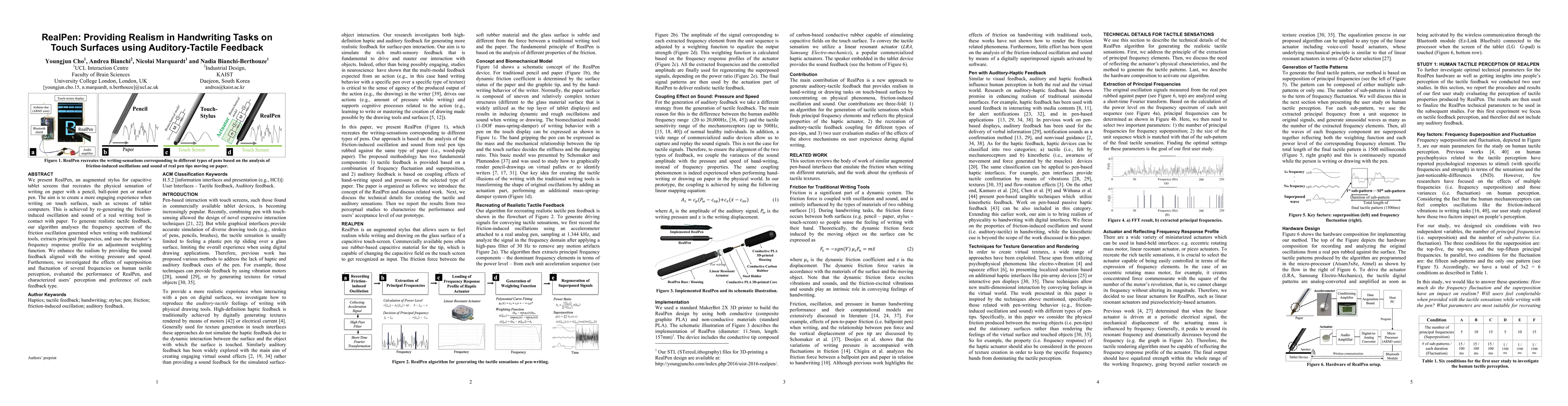 RealPen is an augmented stylus designed to simulate the tactile and auditory sensations of traditional writing tools on capacitive tablet screens, enhancing the user experience through realistic friction-induced oscillation and sound feedback. The study evaluates the effectiveness of various feedback types and users' perceptions of realism and preference.