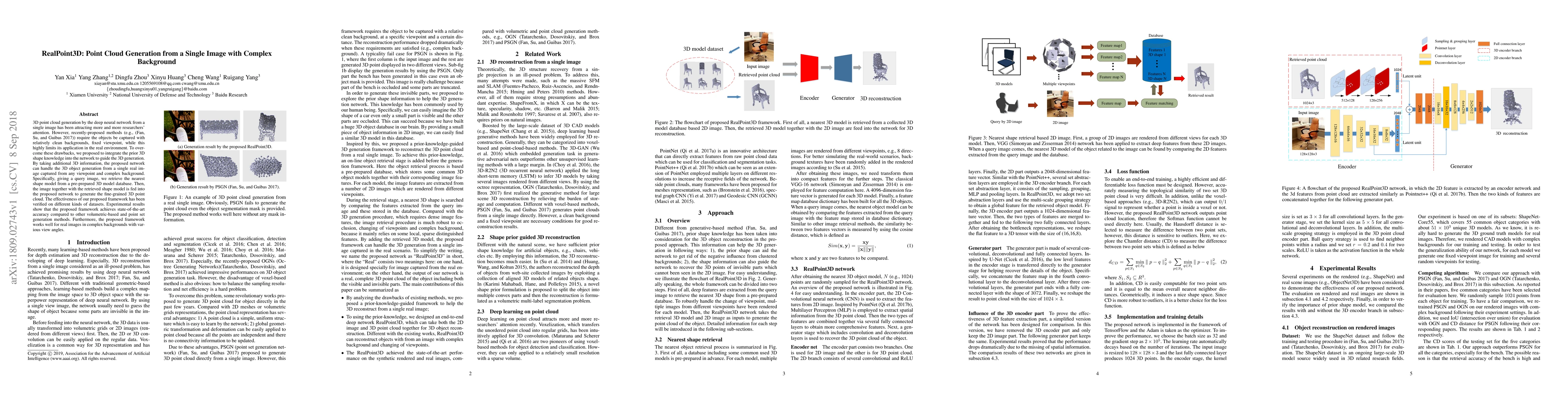The paper introduces RealPoint3D, a deep neural network that generates 3D point clouds from a single image, even with complex backgrounds and varying viewpoints, by integrating prior 3D shape knowledge. Experimental results show superior accuracy and effectiveness compared to existing methods.