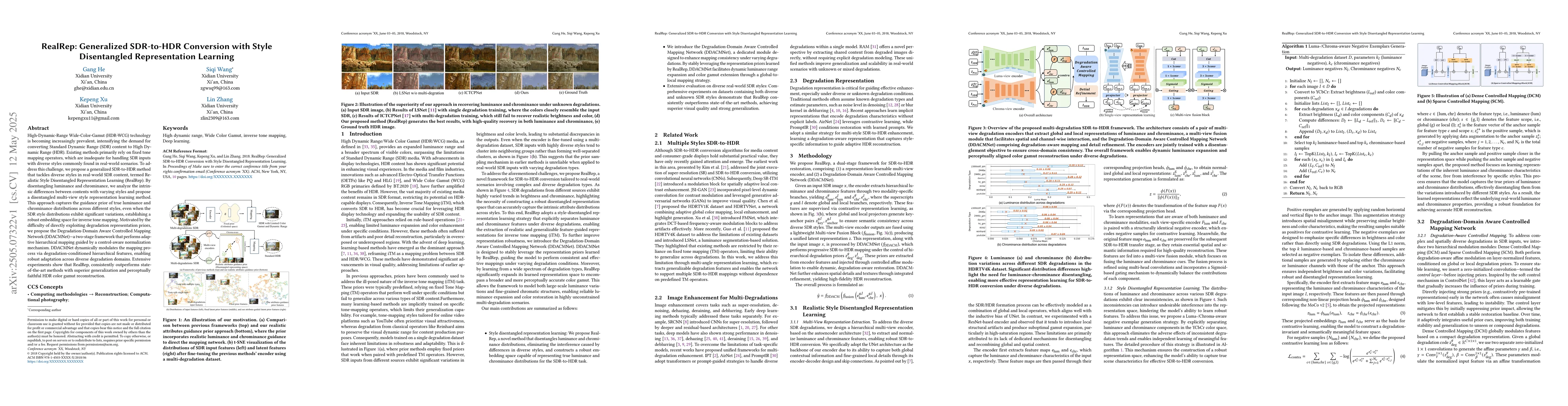 RealRep proposes a new method to convert Standard Dynamic Range (SDR) content to High-Dynamic-Range Wide-Color-Gamut (HDR-WCG) with improved performance on diverse styles, outperforming state-of-the-art methods in color gamut reconstruction.