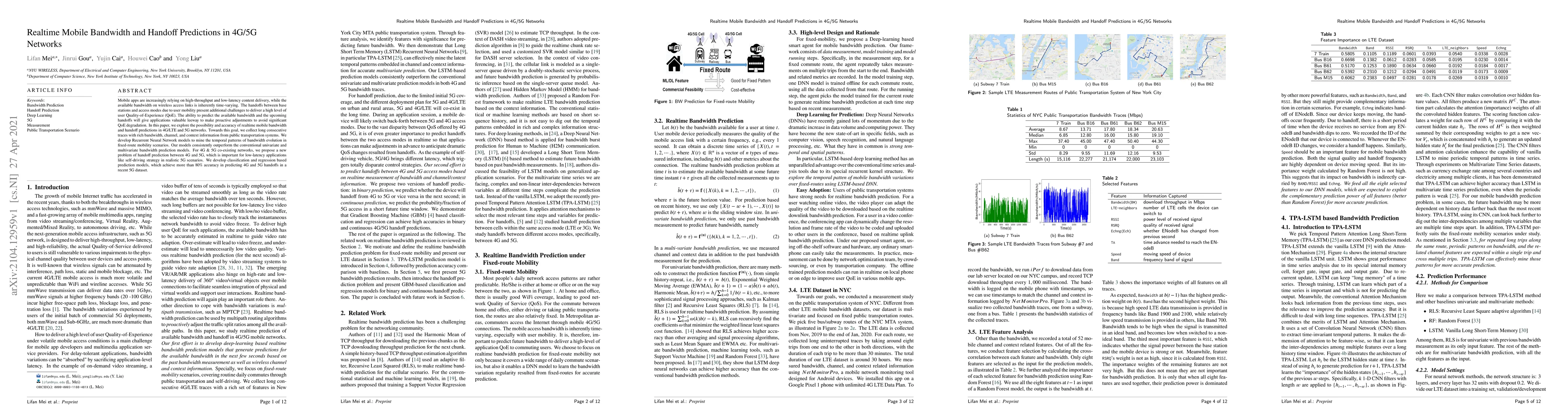 This paper investigates realtime predictions of mobile bandwidth and handoffs in 4G/5G networks using Recurrent Neural Networks to analyze temporal bandwidth patterns. It achieves high accuracy in predicting both bandwidth and handoffs, especially for 4G to 5G transitions, which is crucial for low-latency applications.