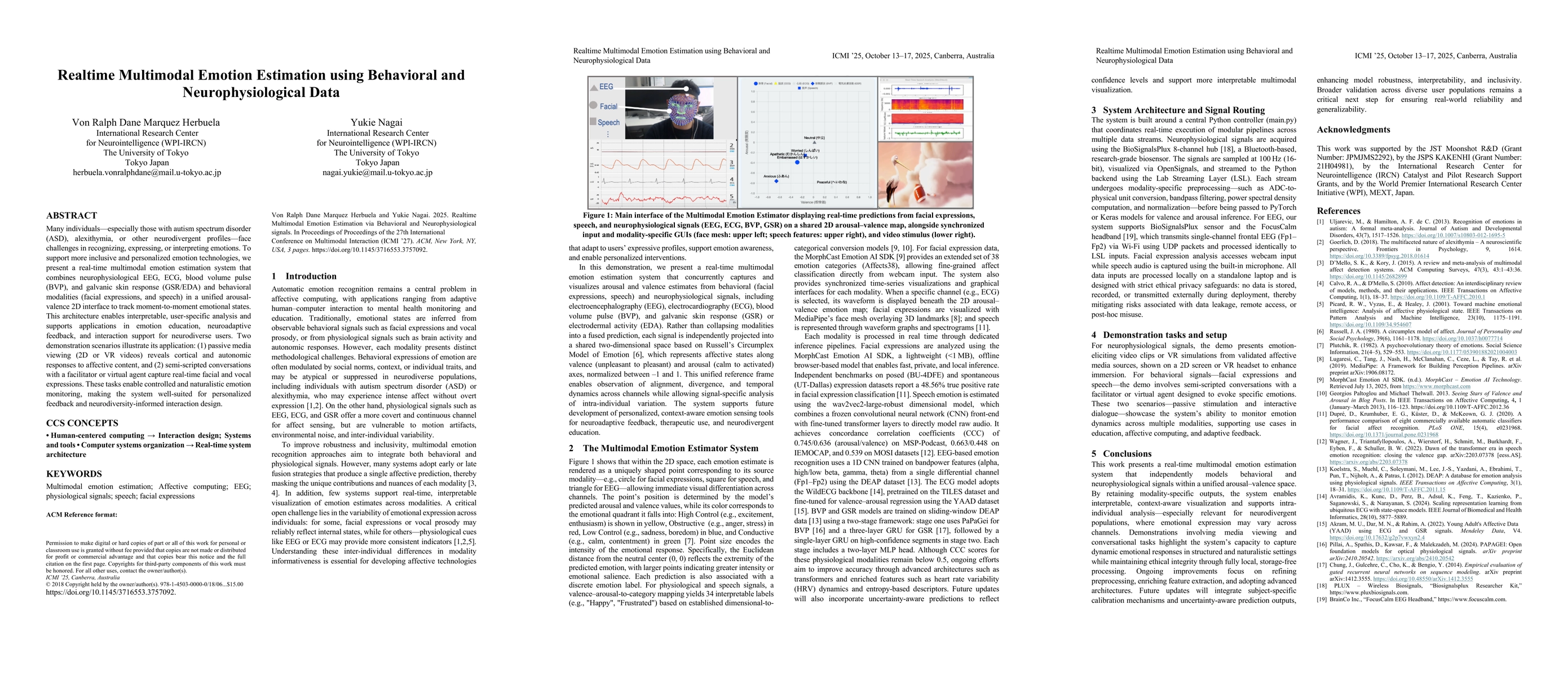 Many individuals especially those with autism spectrum disorder (ASD), alexithymia, or other neurodivergent profiles face challenges in recognizing, expressing, or interpreting emotions. To support more inclusive and personalized emotion technologies, we present a real-time multimodal emotion estimation system that combines neurophysiological EEG, ECG, blood volume pulse (BVP), and galvanic skin response (GSR/EDA) and behavioral modalities (facial expressions, and speech) in a unified arousal-valence 2D interface to track moment-to-moment emotional states. This architecture enables interpretable, user-specific analysis and supports applications in emotion education, neuroadaptive feedback, and interaction support for neurodiverse users. Two demonstration scenarios illustrate its application: (1) passive media viewing (2D or VR videos) reveals cortical and autonomic responses to affective content, and (2) semi-scripted conversations with a facilitator or virtual agent capture real-time facial and vocal expressions. These tasks enable controlled and naturalistic emotion monitoring, making the system well-suited for personalized feedback and neurodiversity-informed interaction design.