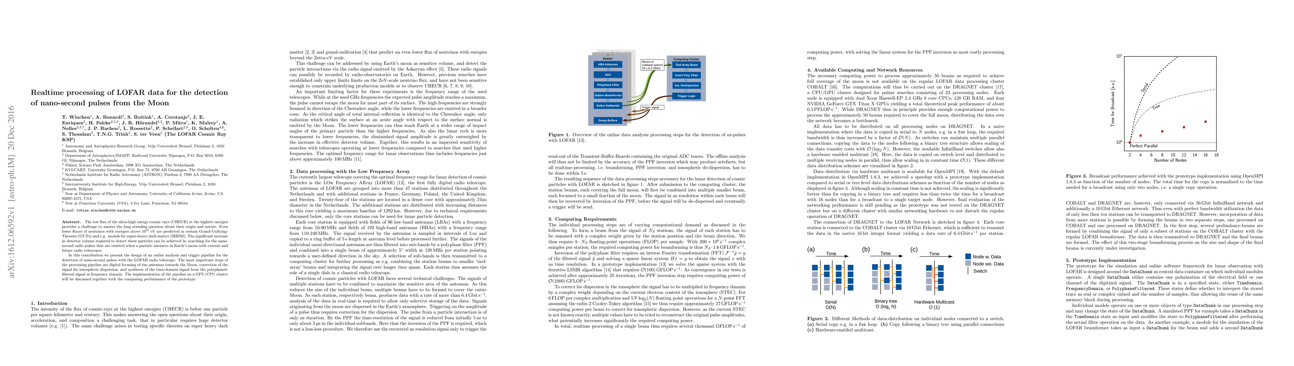 The low flux of the ultra-high energy cosmic rays (UHECR) at the highest energies provides a challenge to answer the long standing question about their origin and nature. Even lower fluxes of neutrinos with energies above $10^{22}$ eV are predicted in certain Grand-Unifying-Theories (GUTs) and e.g.\ models for super-heavy dark matter (SHDM). The significant increase in detector volume required to detect these particles can be achieved by searching for the nano-second radio pulses that are emitted when a particle interacts in Earth's moon with current and future radio telescopes. In this contribution we present the design of an online analysis and trigger pipeline for the detection of nano-second pulses with the LOFAR radio telescope. The most important steps of the processing pipeline are digital focusing of the antennas towards the Moon, correction of the signal for ionospheric dispersion, and synthesis of the time-domain signal from the polyphased-filtered signal in frequency domain. The implementation of the pipeline on a GPU/CPU cluster will be discussed together with the computing performance of the prototype.