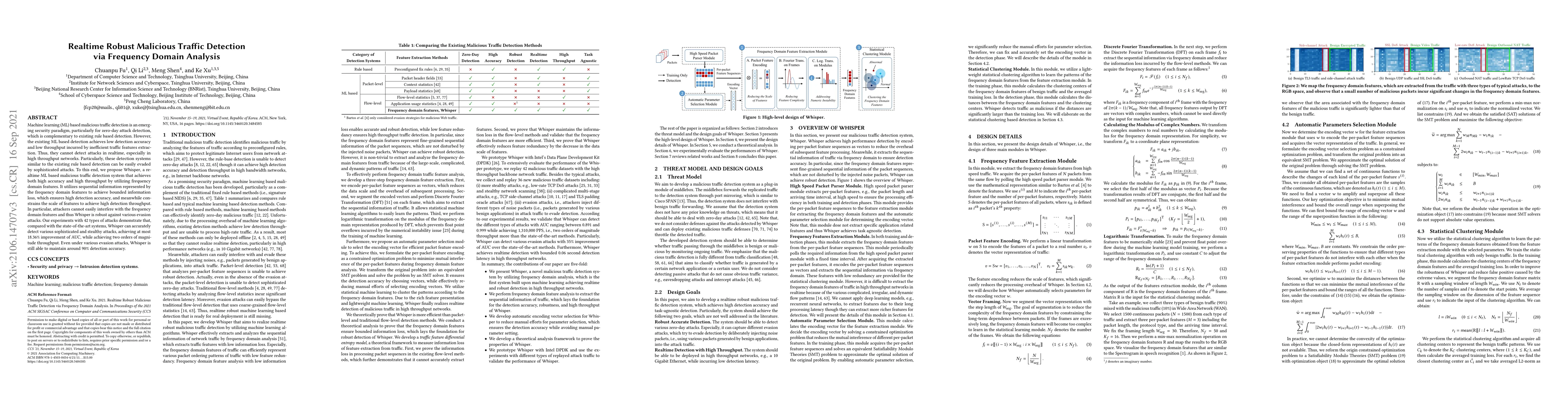 This paper proposes Whisper, a realtime ML-based system for detecting malicious traffic using frequency domain features, achieving high accuracy and throughput. It demonstrates significant improvements over state-of-the-art systems in detecting sophisticated attacks while maintaining robust performance against evasion tactics.