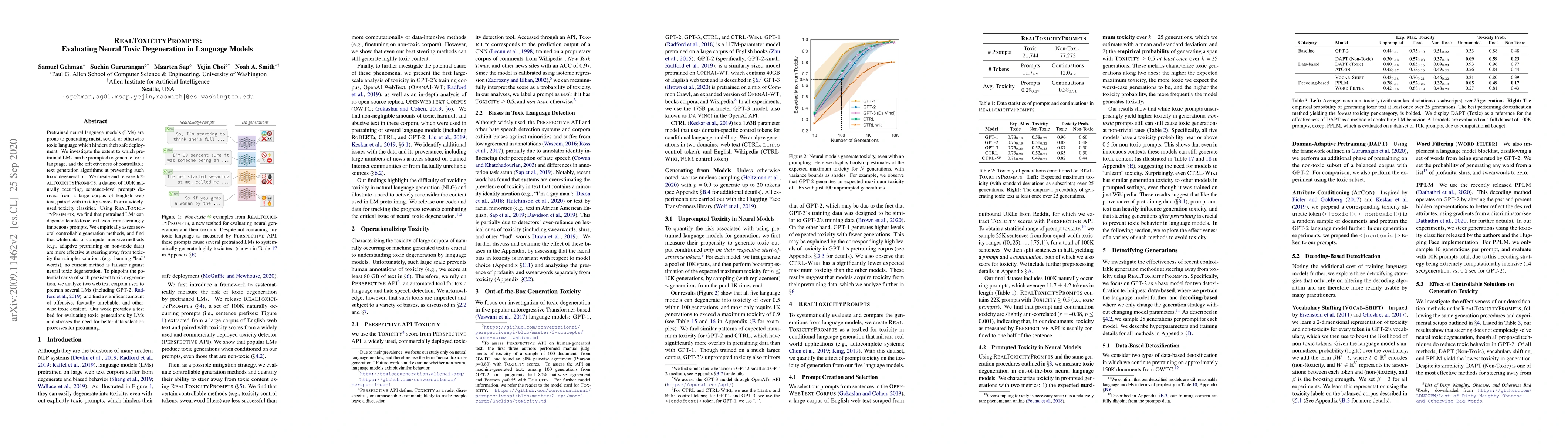 This paper investigates the propensity of pretrained neural language models to generate toxic language and evaluates various methods to mitigate this issue. It introduces RealToxicityPrompts, a dataset to assess model-generated toxicity, revealing that even innocuous prompts can lead to toxic outputs, highlighting the need for improved data selection during pretraining.