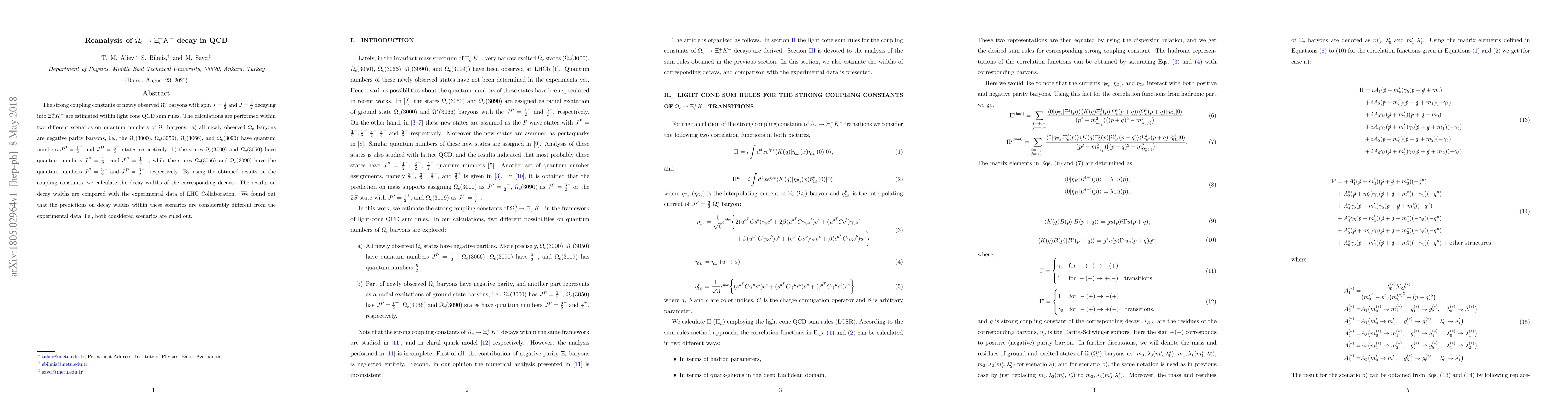 This paper estimates the strong coupling constants for $\Omega_c^0$ baryons decaying into $\Xi_c^+ K^-$ using light cone QCD sum rules under two scenarios of quantum numbers. The calculated decay widths do not match experimental data from LHC, ruling out both scenarios.