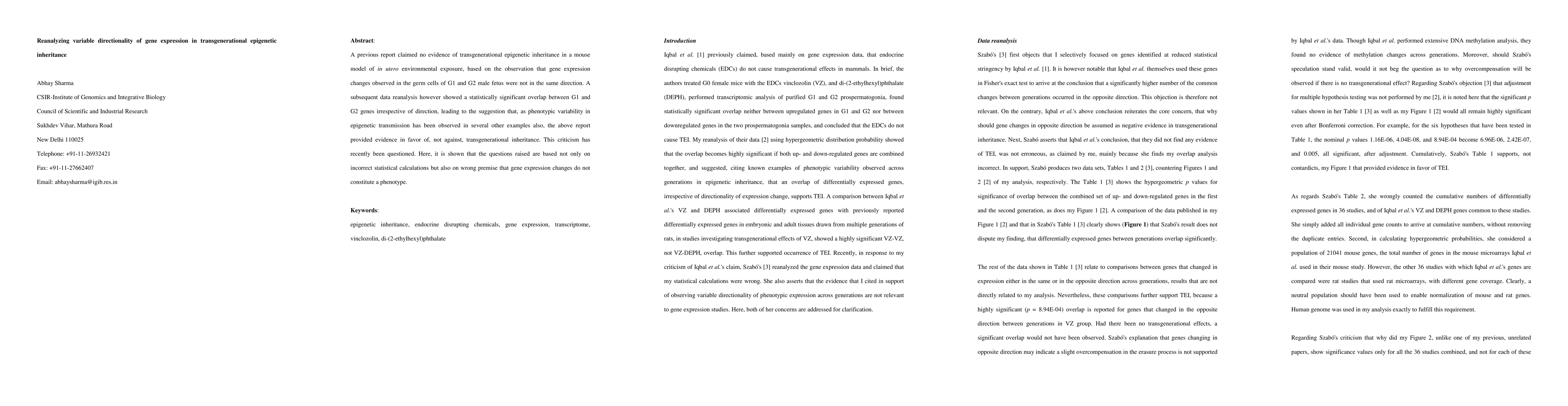 A previous report claimed no evidence of transgenerational epigenetic inheritance in a mouse model of in utero environmental exposure, based on the observation that gene expression changes observed in the germ cells of G1 and G2 male fetus were not in the same direction. A subsequent data reanalysis however showed a statistically significant overlap between G1 and G2 genes irrespective of direction, leading to the suggestion that, as phenotypic variability in epigenetic transmission has been observed in several other examples also, the above report provided evidence in favor of, not against, transgenerational inheritance. This criticism has recently been questioned. Here, it is shown that the questions raised are based not only on incorrect statistical calculations but also on wrong premise that gene expression changes do not constitute a phenotype.