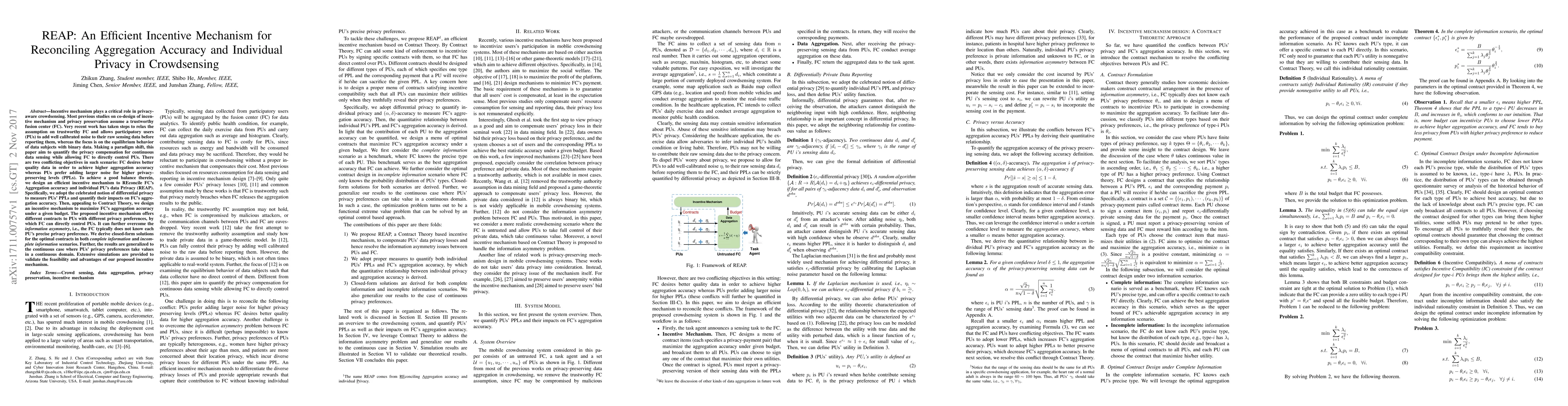 This paper proposes REAP, an efficient incentive mechanism to balance aggregation accuracy and individual privacy in crowdsensing, where users add noise to their data. It leverages differential privacy and contract theory to design contracts that maximize aggregation accuracy under a budget, addressing information asymmetry and providing closed-form solutions for optimal contracts in both complete and incomplete information scenarios.