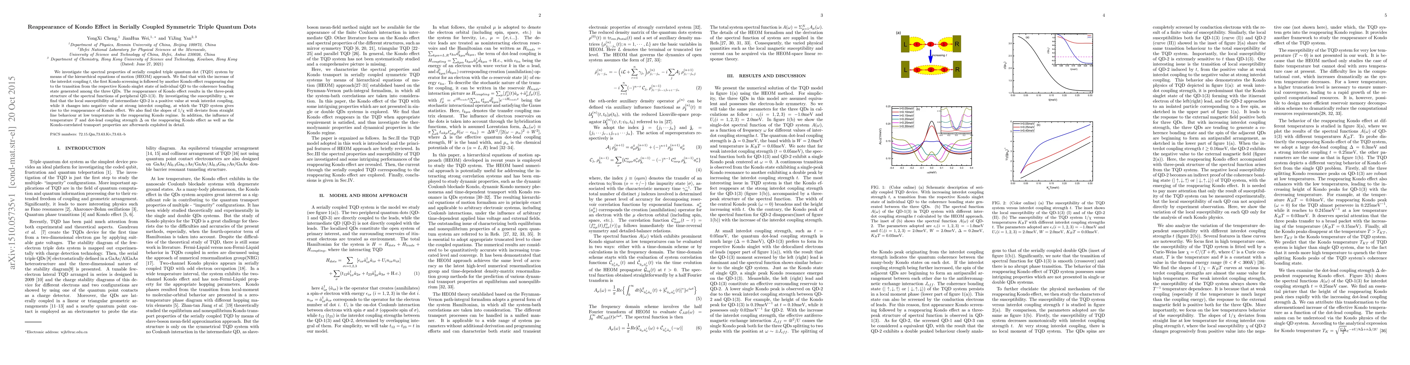 We investigate the spectral properties of serially coupled triple quantum dot (TQD) system by means of the hierarchical equations of motion (HEOM) approach. We find that with the increase of the interdot coupling t, the first Kondo screening is followed by another Kondo effect reappearing due to the transition from the respective Kondo singlet state of individual QD to the coherence bonding state generated among the three QDs. The reappearance of Kondo effect results in the three-peak structure of the spectral functions of peripheral QD-1(3). By investigating the susceptibility \c{hi}, we find that the local susceptibility of intermediate QD-2 is a positive value at weak interdot coupling, while it changes into negative value at strong interdot coupling, at which the TQD system gives rise to the reappearance of Kondo effect. We also find the slopes of 1/\c{hi} will deviate from straight line behaviour at low temperature in the reappearing Kondo regime. In addition, the influence of temperature T and dot-lead coupling strength {\Delta} on the reappearing Kondo effect as well as the Kondo-correlated transport properties are afterwards exploited in detail.