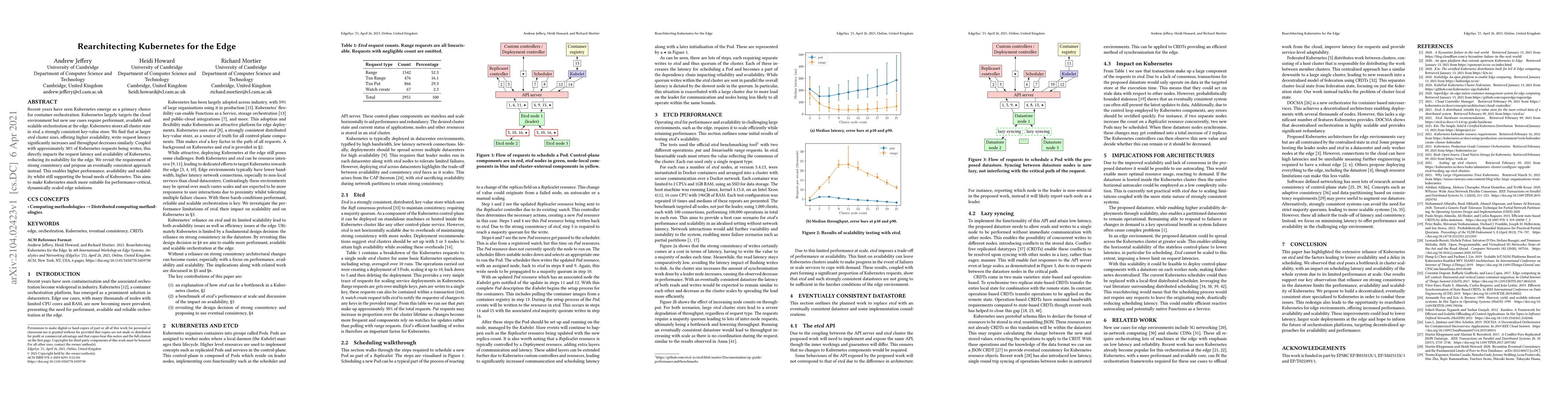 This paper proposes rearchitecting Kubernetes to enhance its performance for edge computing by adopting an eventually consistent approach for etcd, addressing the latency and throughput issues caused by strong consistency in large clusters. This modification aims to improve the overall availability and scalability of Kubernetes for edge use cases.