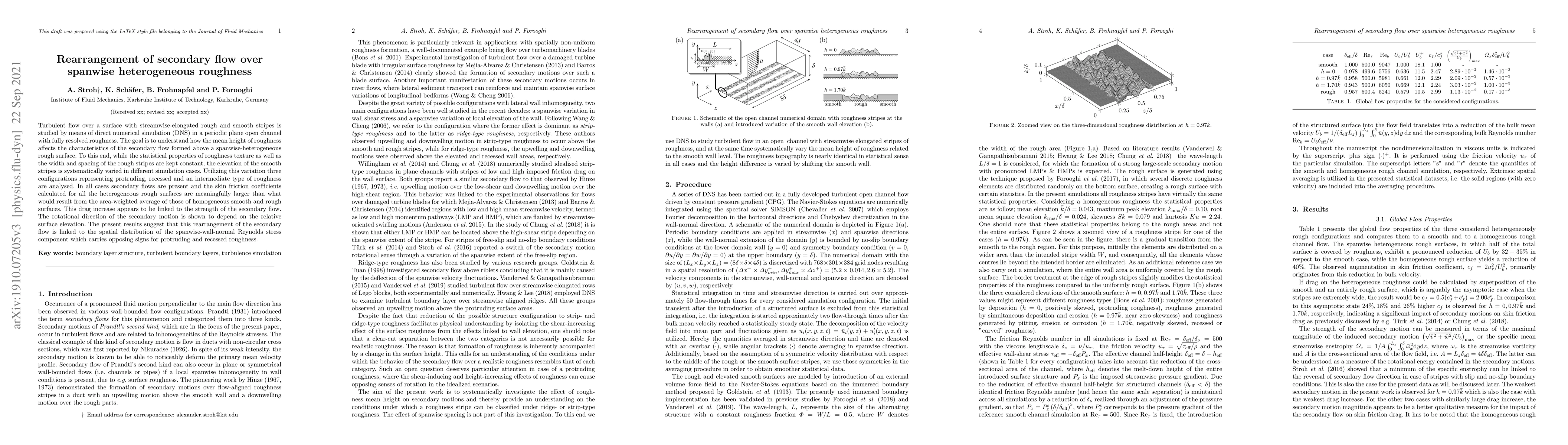 This study uses DNS to investigate turbulent flow over spanwise heterogeneous roughness, focusing on how varying the height of smooth stripes affects secondary flow characteristics. The results show that the mean height of roughness significantly influences secondary flow strength and direction, leading to increased skin friction coefficients.