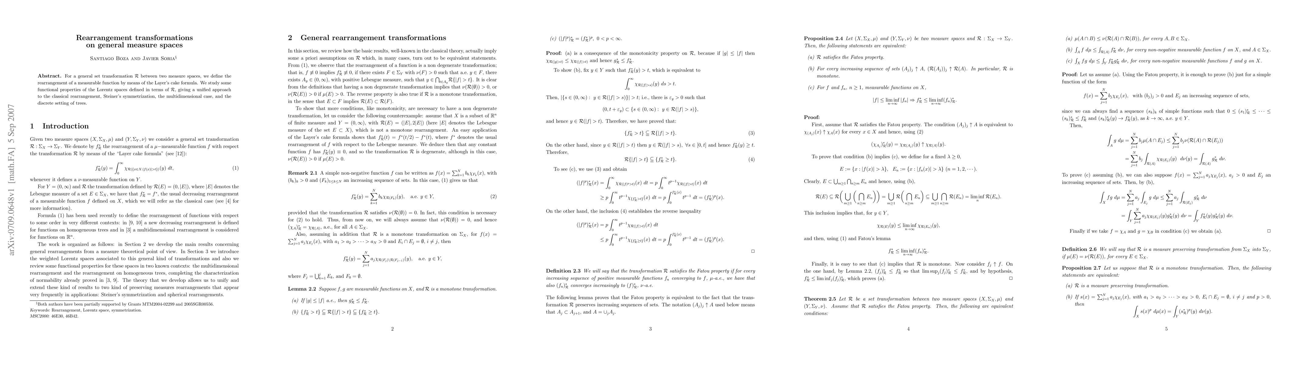 This paper defines the rearrangement of measurable functions using the Layer's cake formula for a general set transformation between measure spaces. It explores functional properties of Lorentz spaces in this context, providing a unified approach to classical rearrangement, Steiner symmetrization, and both multidimensional and discrete settings.