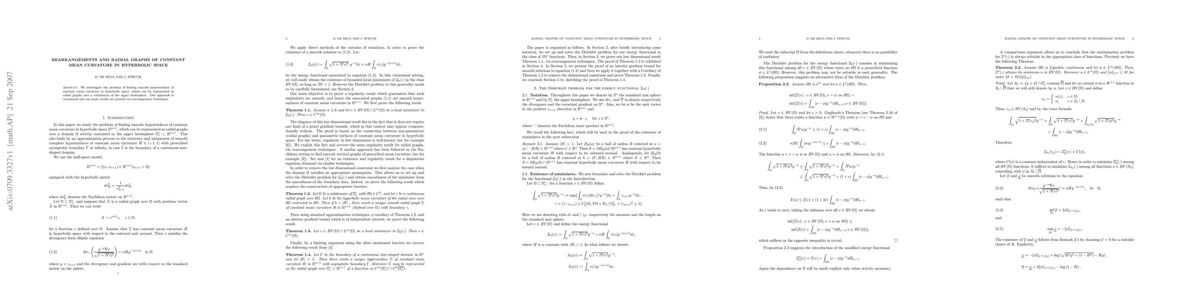 Summary: This paper explores smooth hypersurfaces of constant mean curvature in hyperbolic space, represented as radial graphs over a subdomain of the upper hemisphere, using variational methods and rearrangement techniques to prove its main results.