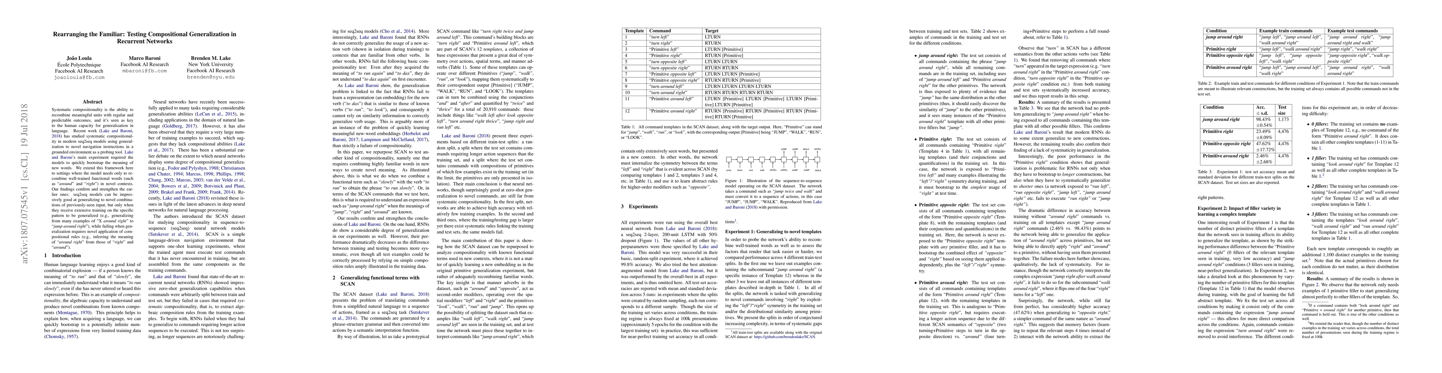 Systematic compositionality is the ability to recombine meaningful units with regular and predictable outcomes, and it's seen as key to humans' capacity for generalization in language. Recent work has studied systematic compositionality in modern seq2seq models using generalization to novel navigation instructions in a grounded environment as a probing tool, requiring models to quickly bootstrap the meaning of new words. We extend this framework here to settings where the model needs only to recombine well-trained functional words (such as "around" and "right") in novel contexts. Our findings confirm and strengthen the earlier ones: seq2seq models can be impressively good at generalizing to novel combinations of previously-seen input, but only when they receive extensive training on the specific pattern to be generalized (e.g., generalizing from many examples of "X around right" to "jump around right"), while failing when generalization requires novel application of compositional rules (e.g., inferring the meaning of "around right" from those of "right" and "around").