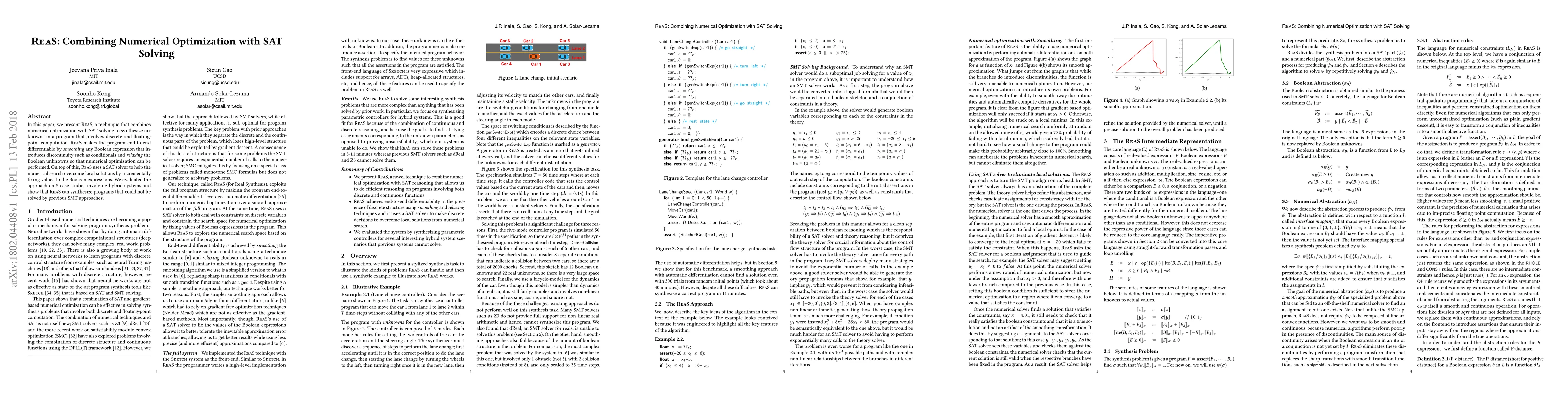 This paper introduces ReaS, a technique that combines numerical optimization with SAT solving to synthesize hybrid programs. It successfully solves previously unsolvable cases, showing its potential for end-to-end differentiable synthesis in hybrid systems.