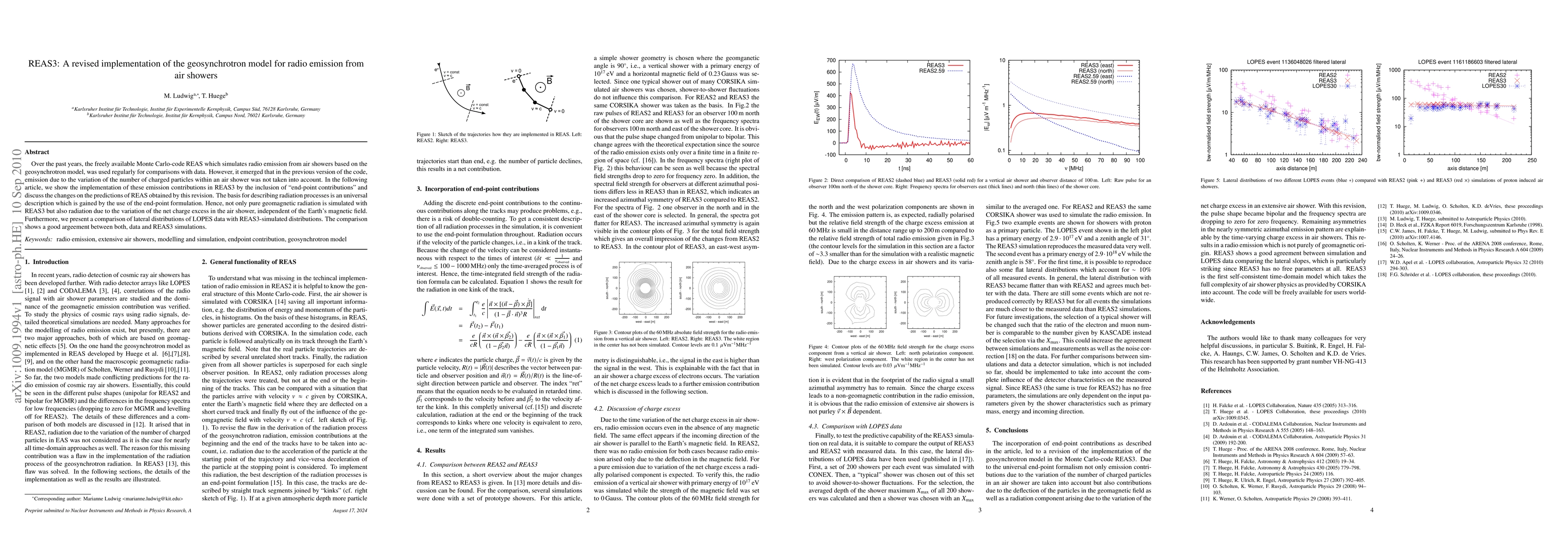 REAS3 revises the geosynchrotron model for simulating radio emission from air showers by including "end-point contributions" to account for variations in charged particles, leading to improved predictions. The new model also simulates radiation due to net charge excess, and comparisons with LOPES data show good agreement.