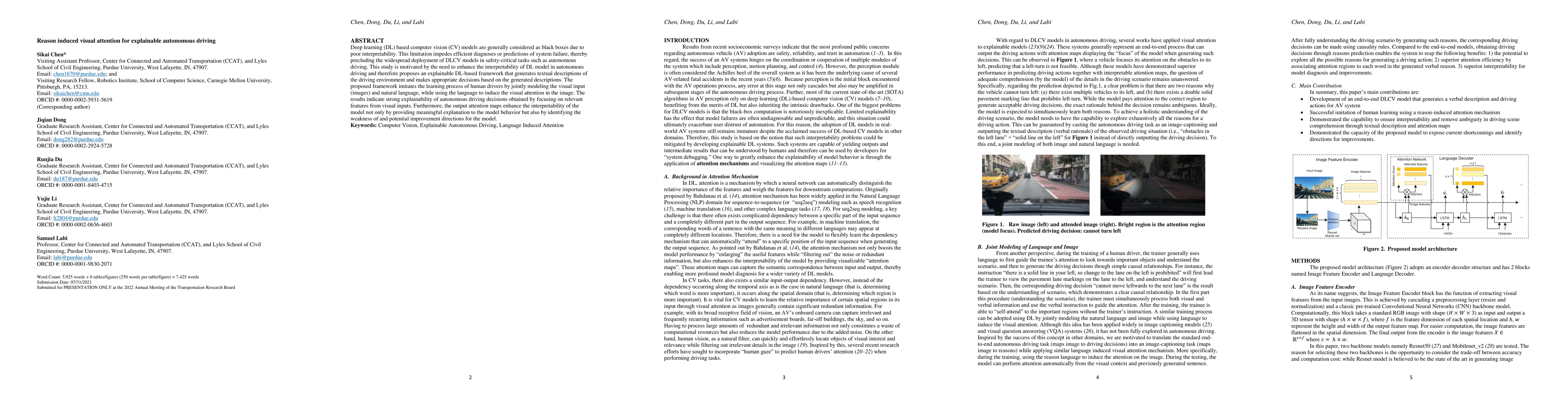 Deep learning (DL) based computer vision (CV) models are generally considered as black boxes due to poor interpretability. This limitation impedes efficient diagnoses or predictions of system failure, thereby precluding the widespread deployment of DLCV models in safety-critical tasks such as autonomous driving. This study is motivated by the need to enhance the interpretability of DL model in autonomous driving and therefore proposes an explainable DL-based framework that generates textual descriptions of the driving environment and makes appropriate decisions based on the generated descriptions. The proposed framework imitates the learning process of human drivers by jointly modeling the visual input (images) and natural language, while using the language to induce the visual attention in the image. The results indicate strong explainability of autonomous driving decisions obtained by focusing on relevant features from visual inputs. Furthermore, the output attention maps enhance the interpretability of the model not only by providing meaningful explanation to the model behavior but also by identifying the weakness of and potential improvement directions for the model.
