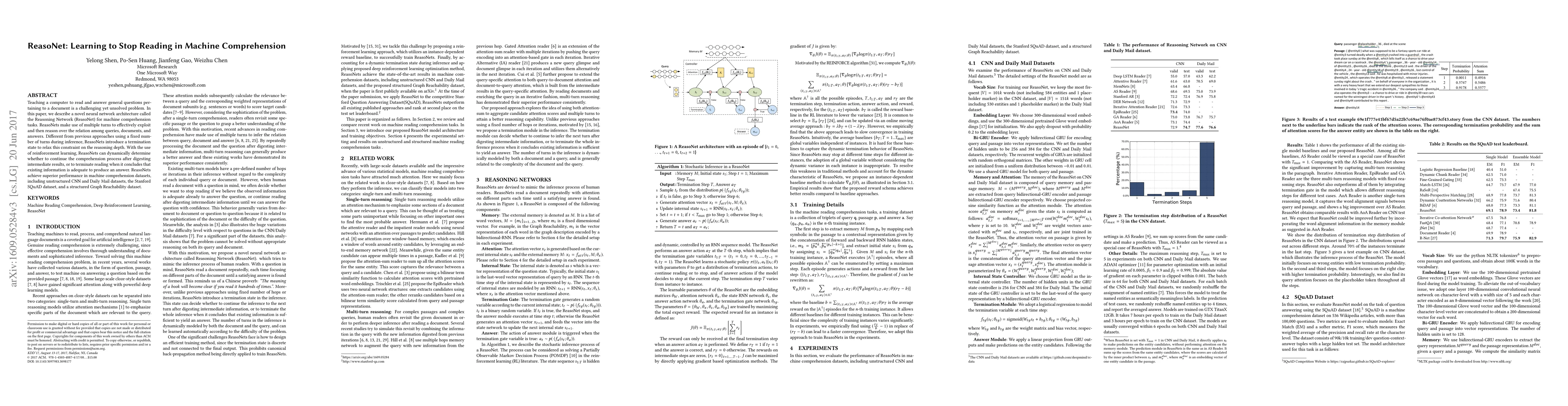 ReasoNet introduces a novel neural network architecture for machine comprehension that uses multiple reasoning turns and a termination state to dynamically decide when to stop reading. This adaptive approach, guided by reinforcement learning, significantly improves performance on various comprehension datasets.