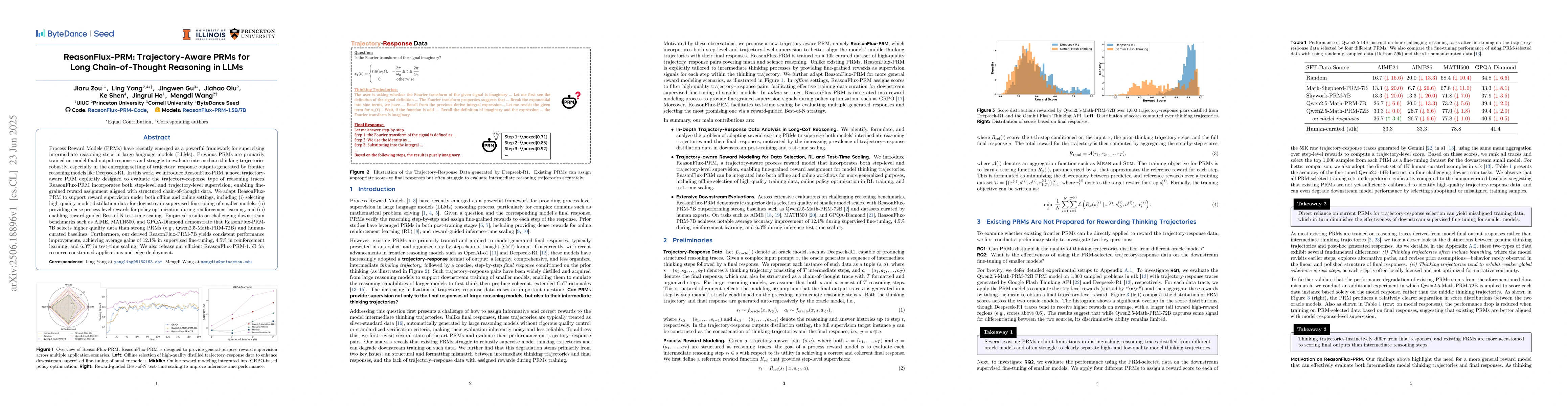 The research introduces ReasonFlux-PRM, a novel trajectory-aware Process Reward Model designed to evaluate intermediate reasoning steps in large language models. It improves upon existing PRMs by incorporating both step-level and trajectory-level supervision, demonstrating significant performance gains in supervised fine-tuning, reinforcement learning, and test-time scaling on benchmarks like AIME, MATH500, and GPQA-Diamond. The model also supports resource-constrained applications with an efficient ReasonFlux-PRM-1.5B version.
