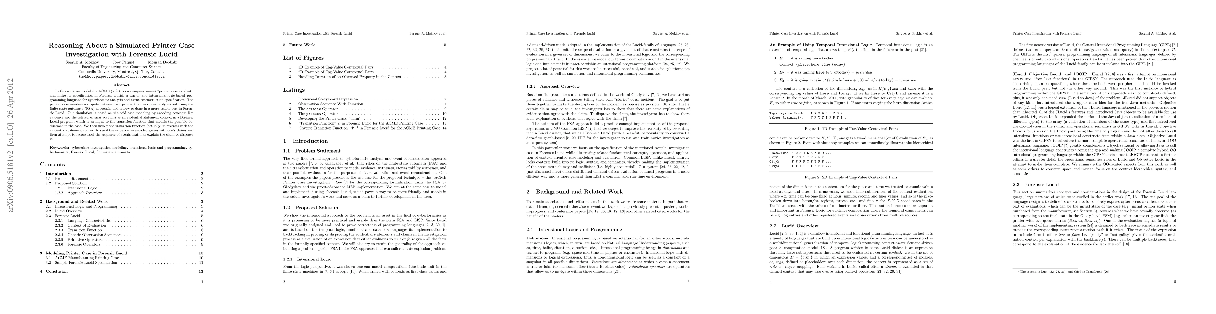 This paper models a simulated printer case dispute in Forensic Lucid, a logic-based programming language for cyberforensic analysis, to reconstruct and verify claims using encoded evidence and witness accounts. The approach aims to provide a more usable method than the previous finite-state automata solution.