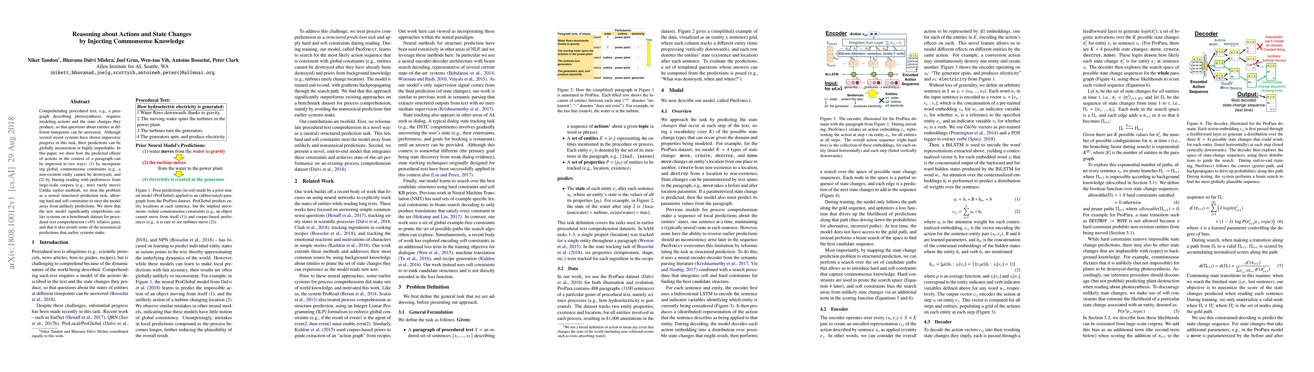 Comprehending procedural text, e.g., a paragraph describing photosynthesis, requires modeling actions and the state changes they produce, so that questions about entities at different timepoints can be answered. Although several recent systems have shown impressive progress in this task, their predictions can be globally inconsistent or highly improbable. In this paper, we show how the predicted effects of actions in the context of a paragraph can be improved in two ways: (1) by incorporating global, commonsense constraints (e.g., a non-existent entity cannot be destroyed), and (2) by biasing reading with preferences from large-scale corpora (e.g., trees rarely move). Unlike earlier methods, we treat the problem as a neural structured prediction task, allowing hard and soft constraints to steer the model away from unlikely predictions. We show that the new model significantly outperforms earlier systems on a benchmark dataset for procedural text comprehension (+8% relative gain), and that it also avoids some of the nonsensical predictions that earlier systems make.