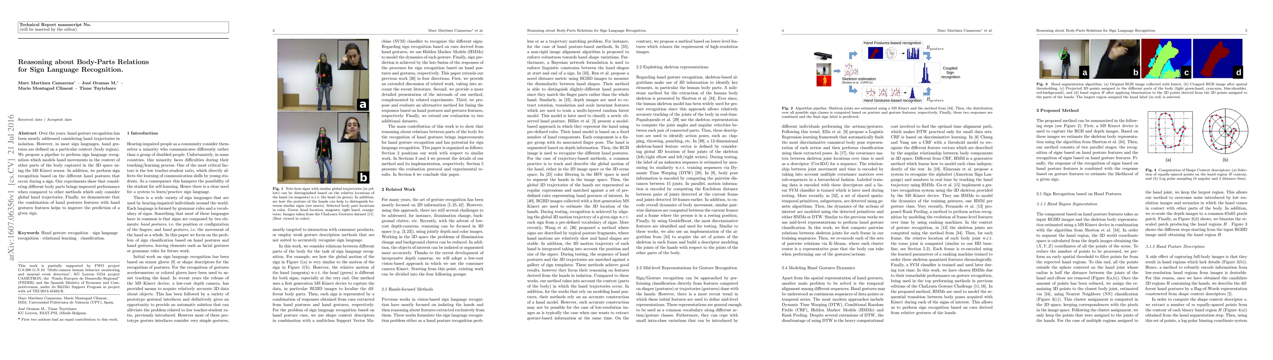 This paper proposes a method for sign language recognition that models hand movements in relation to other body parts using 3D data from the MS Kinect sensor. It demonstrates improved performance by incorporating hand postures and body-part relations compared to methods focusing solely on hand trajectories.