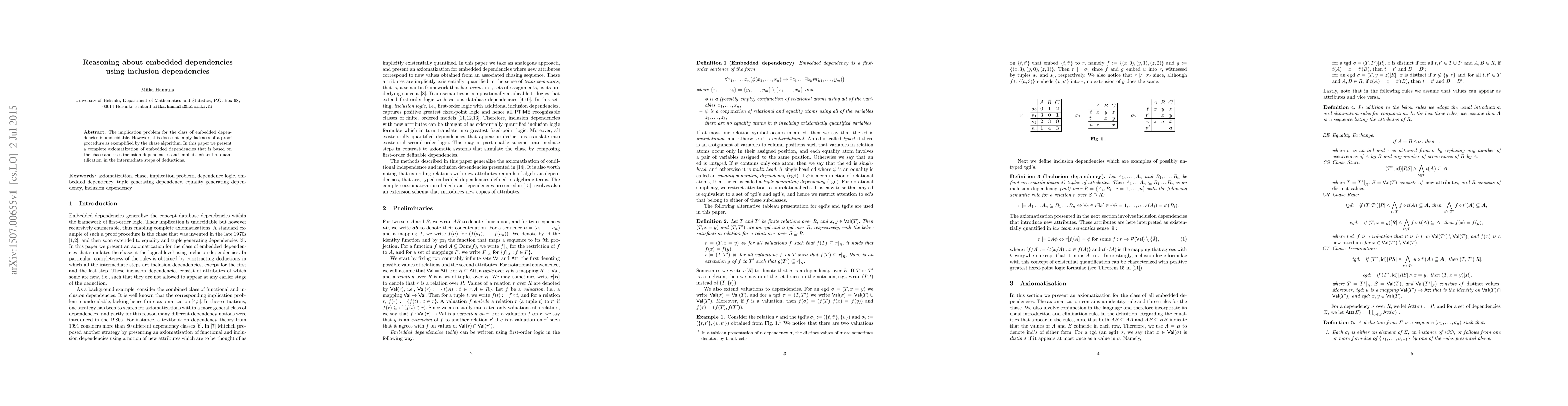 This paper presents a complete axiomatization of embedded dependencies based on the chase algorithm, utilizing inclusion dependencies and implicit existential quantification to facilitate reasoning despite the undecidability of the implication problem for embedded dependencies.